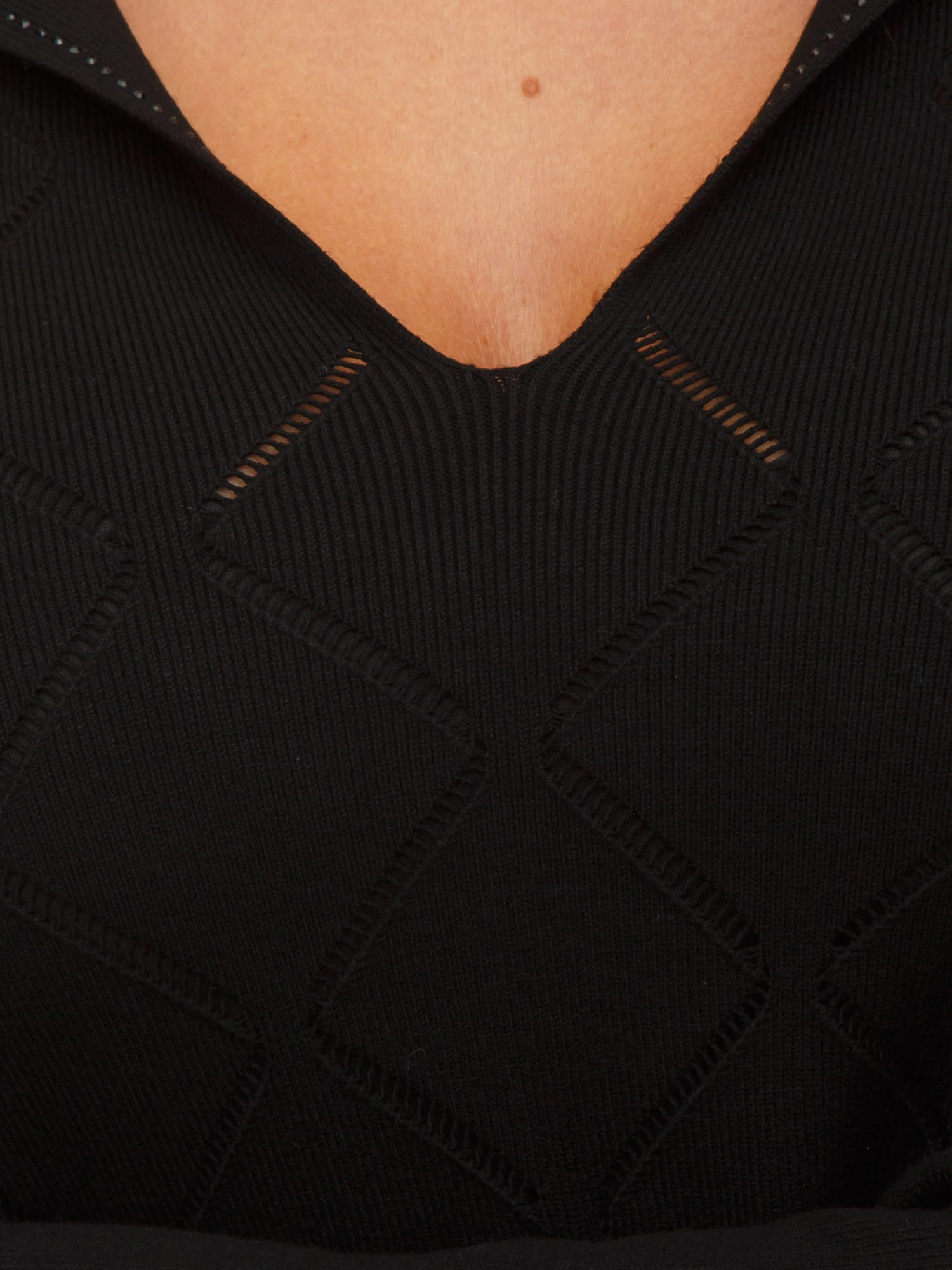 Brand: BLUGIRLNon passerà inosservato l'abito Blugirl in viscosa stretch con lavorazione a effetto punzonato che crea un motivo a rombi. Scollo a polo con strass, linea morbida e sottoveste abbinata. Ideale per elevare i tuoi look day-to-night in un attimo. La modella è alta 1.72 e indossa la taglia XS.
