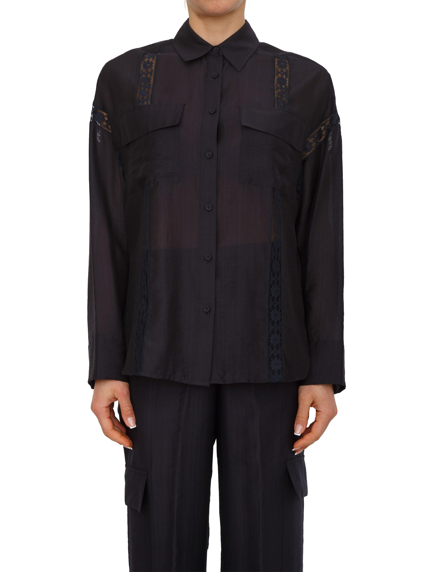 Brand: BLUGIRLFluida e leggera, questa camicia Blugirl in lyocell con inserti in pizzo see-through. ha chiusura con bottoni in tono, maniche lunghe con polsino e bottone, spalle scese, tasche applicate con patta, linea morbida. in total look con i pantaloni in coordinato per un'occasione speciale rilassata. La modella è alta 1.72 e indossa la taglia 40.