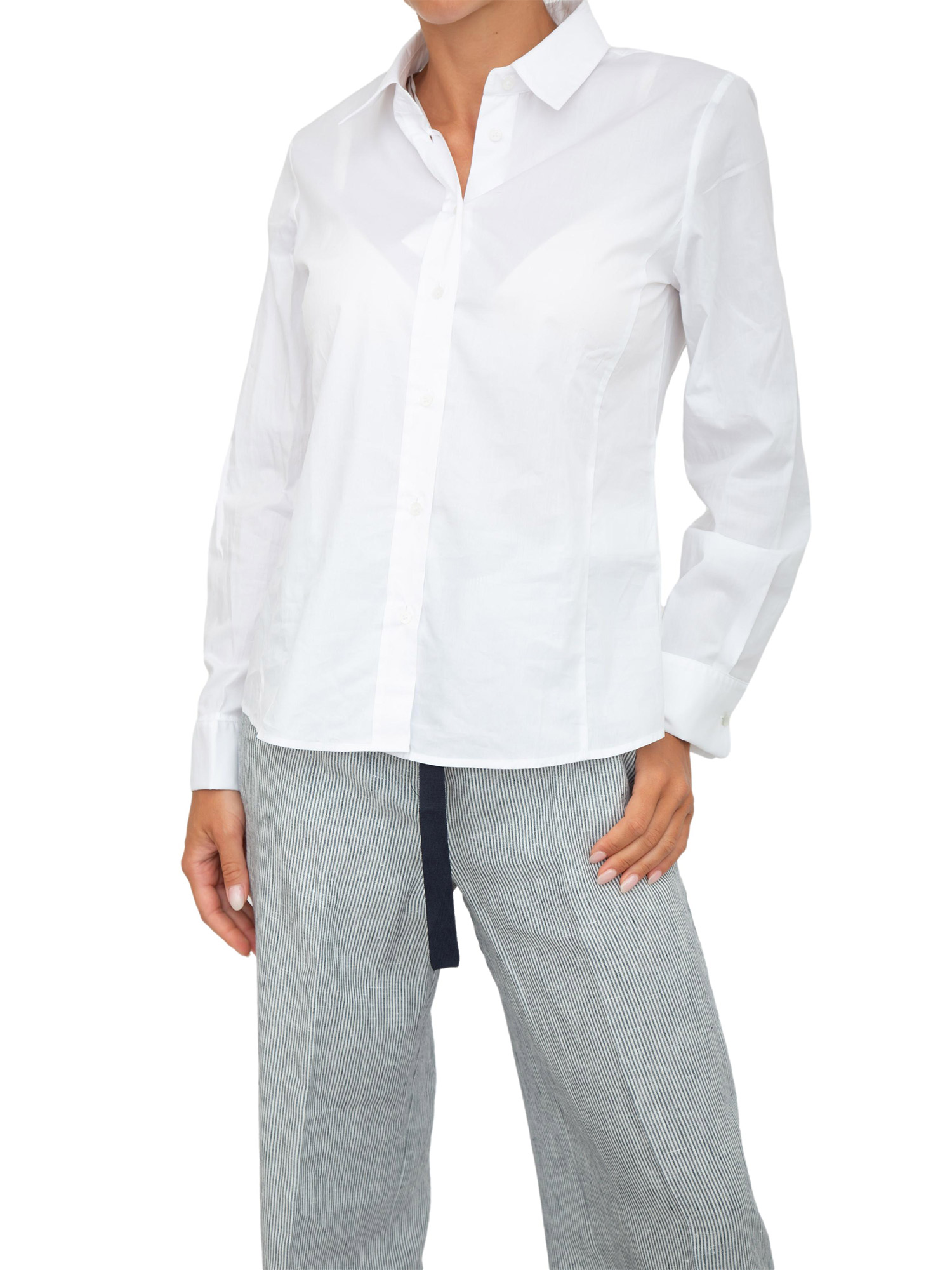 Brand: IBLUESCamicia manica lunga donna firmata iBlues realizzata in popeline di cotone stretch. Design dalla lnea sfiancata con colletto, chiusura con bottoni e polsini con gemelli. Un classico evergreen, con il dettaglio elegante dei polsini maschili. La modella è alta 1.72 e indossa la taglia 42.