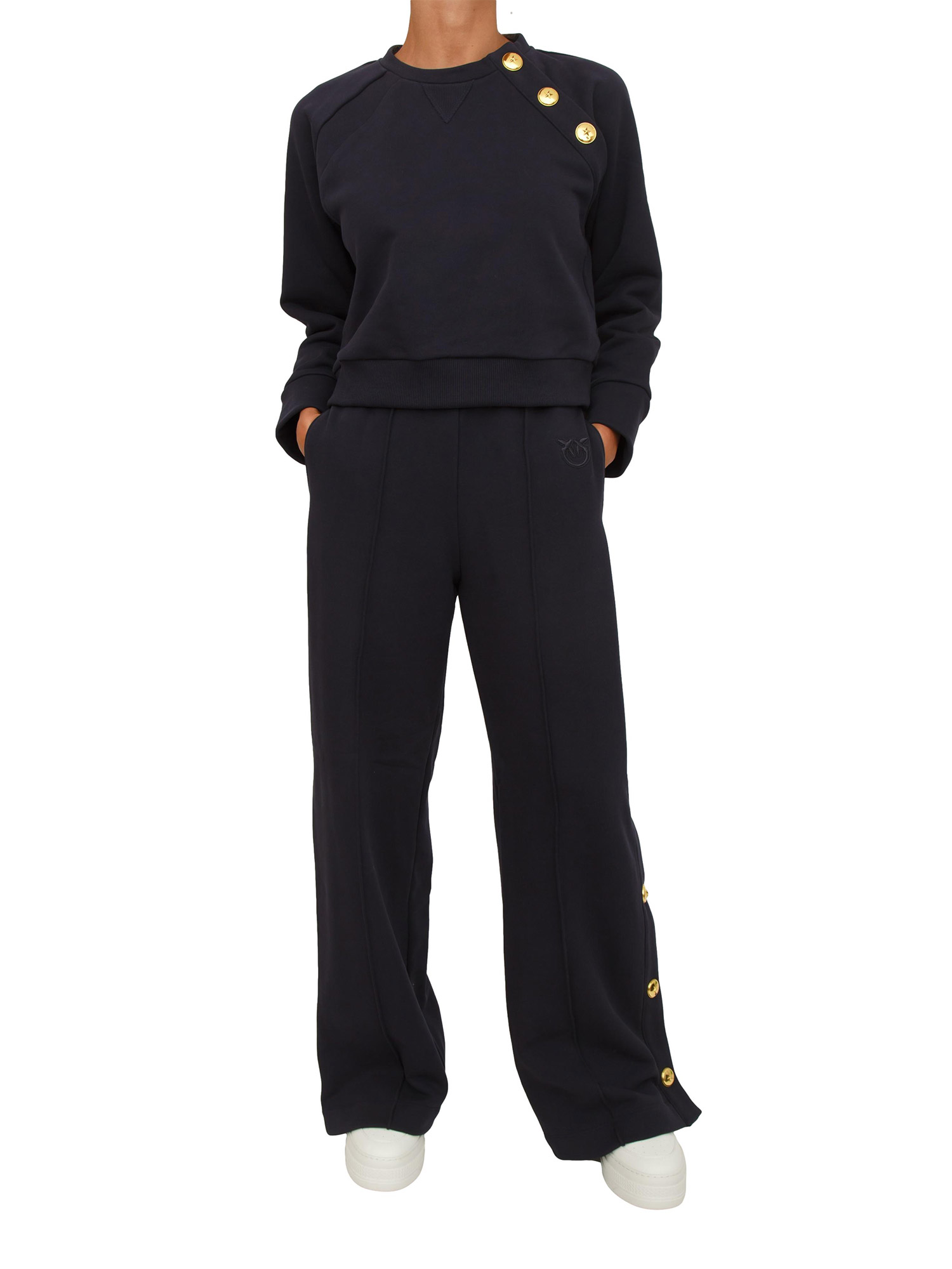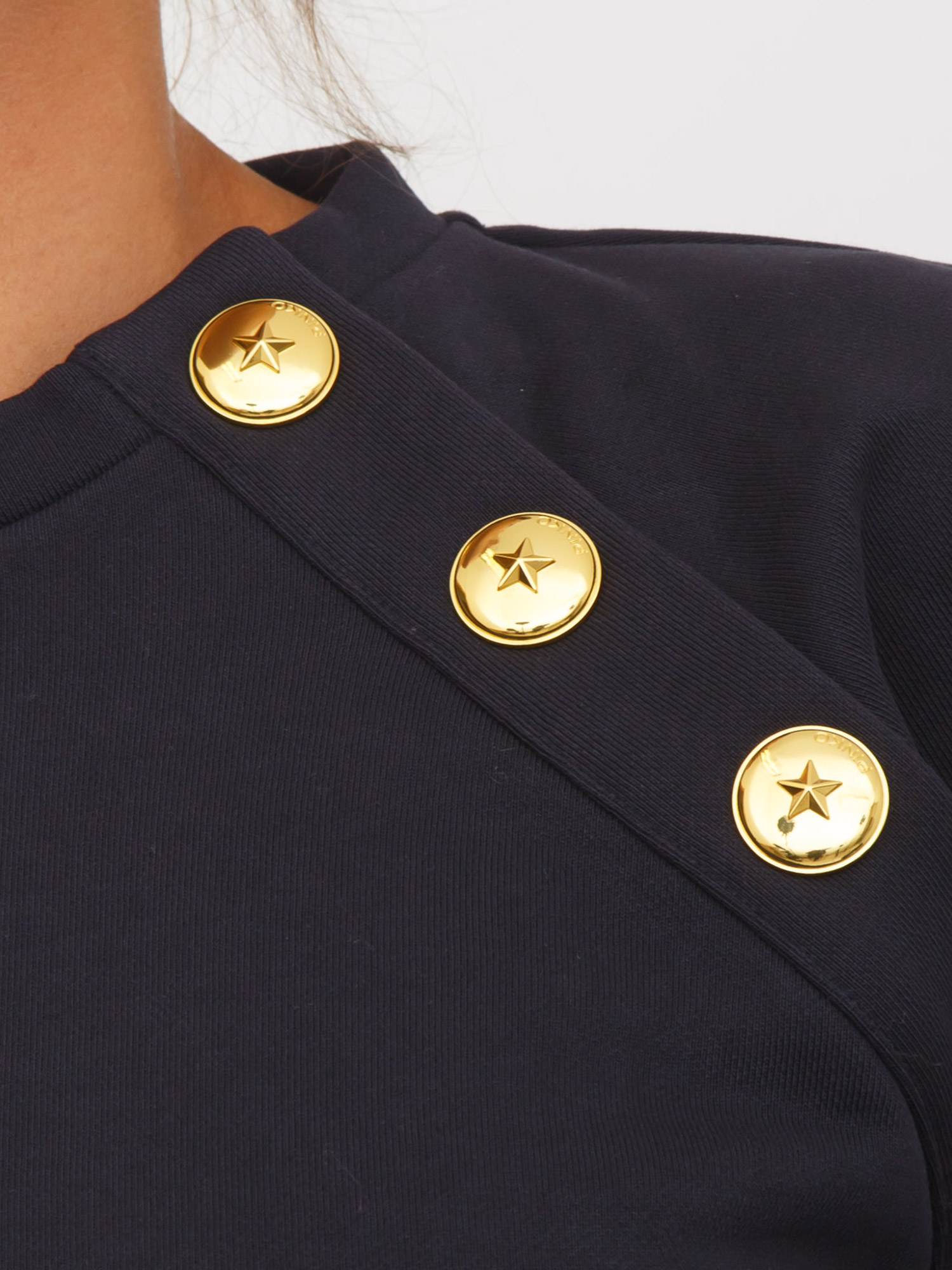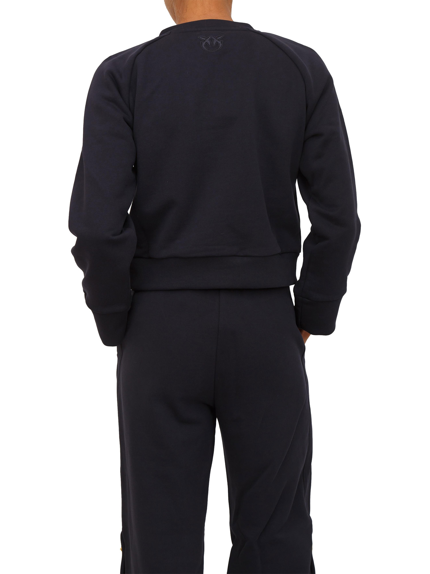 Brand: PINKOFelpa Pinko realizzata in cotone con maniche lunghe raglan e inserto triangolare a V. Il taglio delle spalle è chiuso da bottoni in metallo dorato decorati da stella e il retro è rifinito da una patch ricamato con logo Love Birds. La modella è alta 1.72 e indossa la taglia XS.