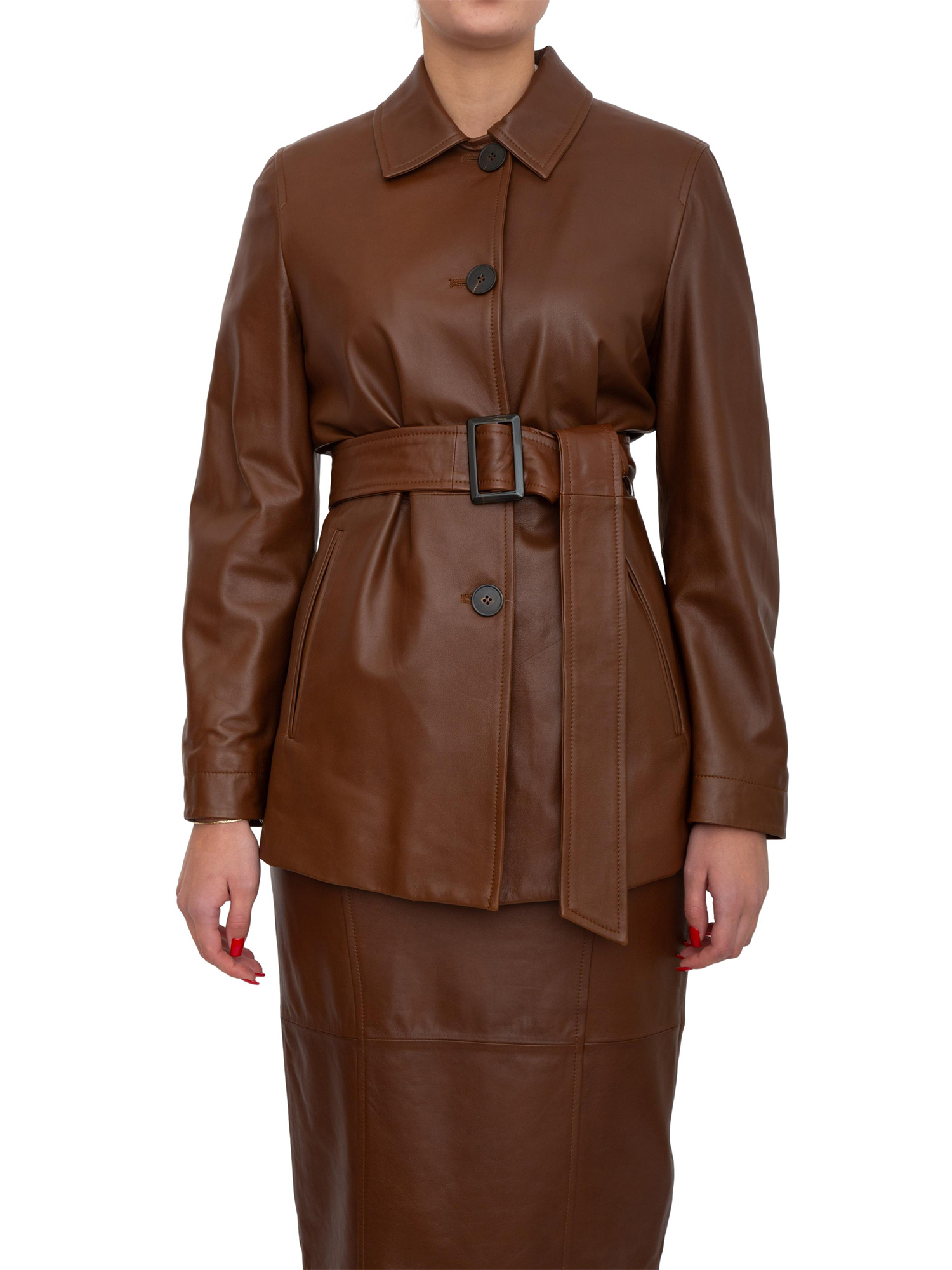 Brand: MAX MARAGiacca donna Tolmin Max Mara realizzata in pelle con dettagli a camicia e cintura abbinata con fibbia in corno. Design leggermente svasato con taglio in vita, colletto a punta e tasche a filetto laterali. Chiusura con bottini e fodera inerna logata. La modella è alta 1.77 e indossa la taglia 42.