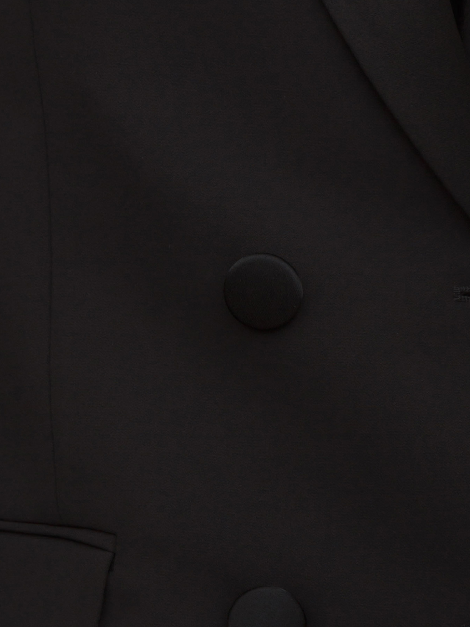 Brand: ELISABETTA FRANCHIGiacca doppiopetto Elisabetta Franchi in crêpe leggero con vestibilità regular. Spalle strutturate, taschino sul petto e patte applicate. Caratterizzata da rever a lancia e bottoni in raso che donano un luminoso contrasto di texture. La modella è alta 1.72 e indossa la taglia 40.