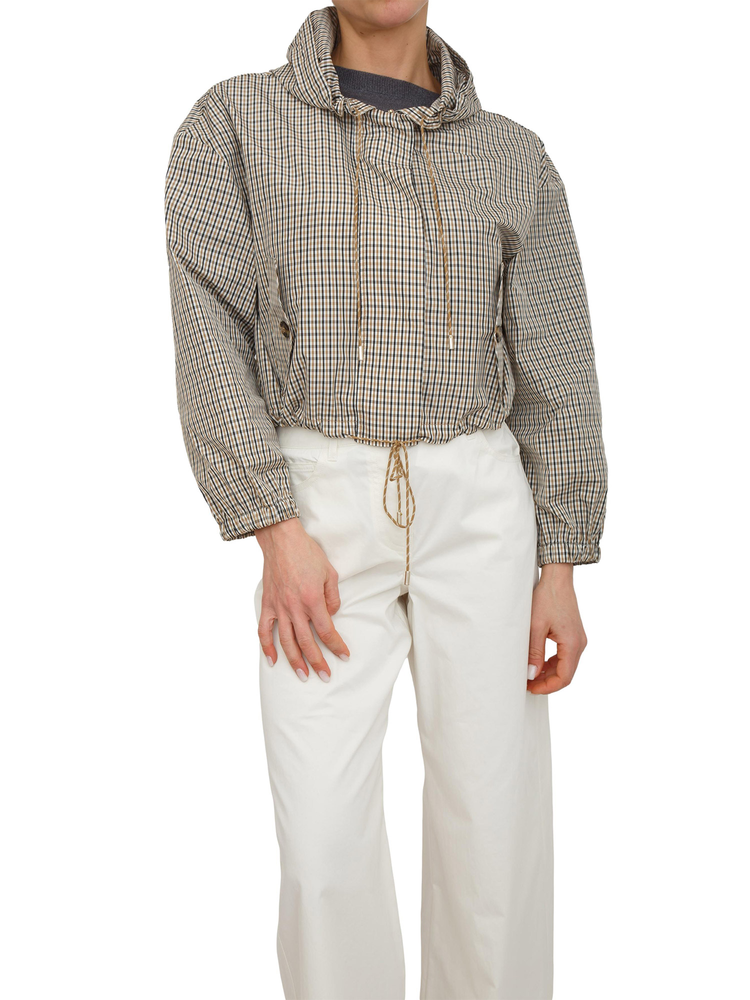 Brand: EMME MARELLAL'allure sportiva del giubbino Emmzamia di Emme Marella trova una nuova energia in questa versione in taffetà. Ampio, con cappuccio e coulisse, si stringe al fondo per regalare un volume morbido e contemporaneo. Chiusura con zip nascosta e spalla scesa. La modella è alta 1.72 e indossa la taglia 40.