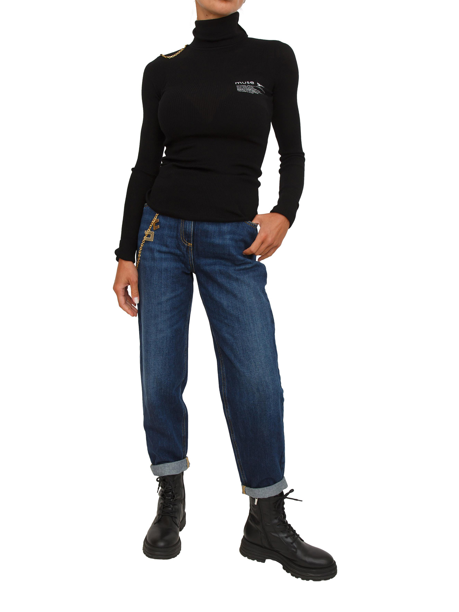 Brand: ELISABETTA FRANCHIMaglia Elisabetta Franchi a collo alto con vestibilità aderente. Ideale come sottogiacca, collo dolcevita con apertura laterale e bottoni dorati e maniche lunghe con risvolto. Impreziosita dalla stampa lettering davanti e dal dettaglio in catena sulla spalla. La modella è alta 1.72 e indossa la taglia 40.