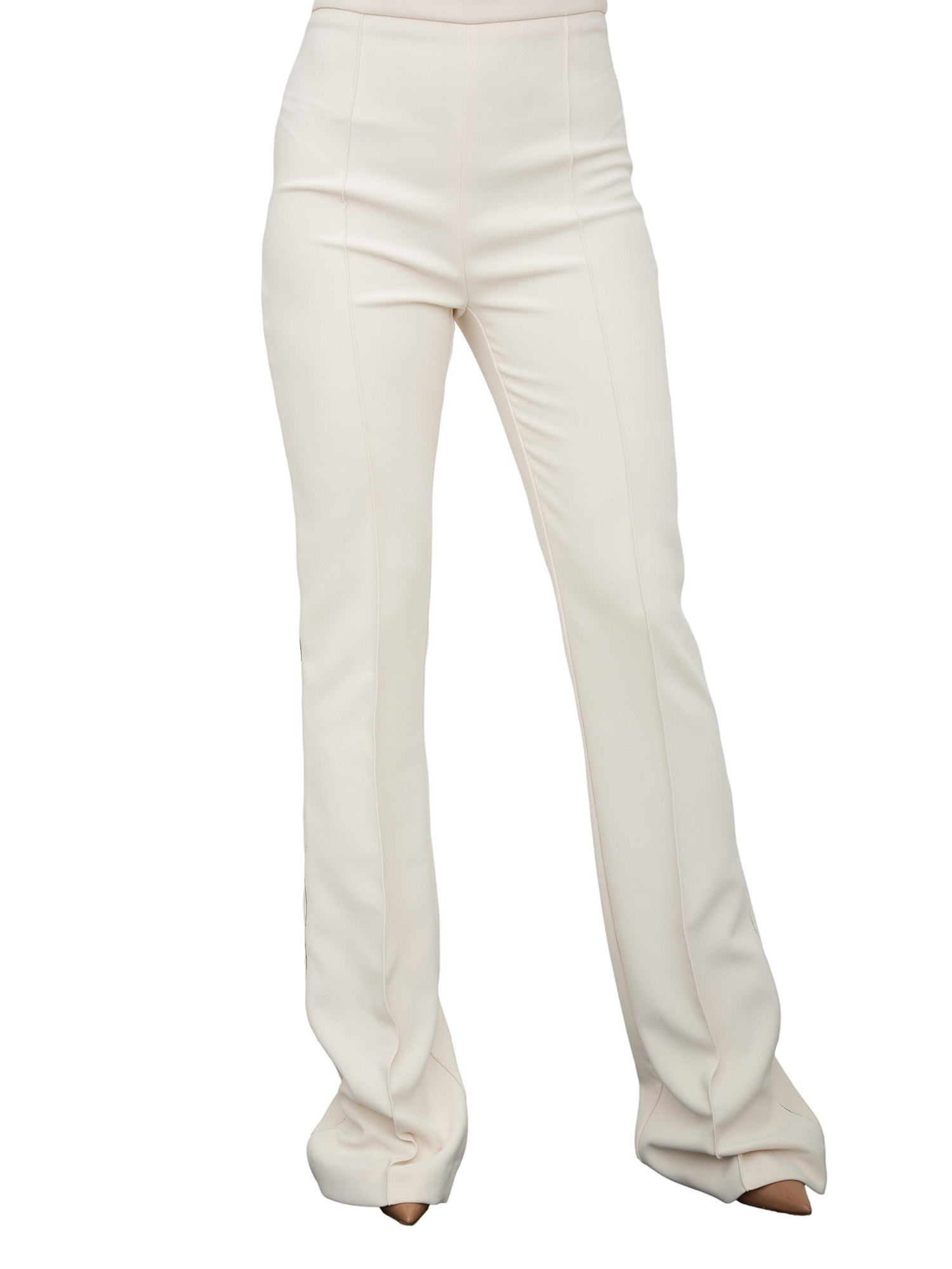 Brand: ELISABETTA FRANCHIPantaloni in crêpe stretch leggero con fascione in vita e gamba svasata al fondo. Il capo si distingue per i dettagli di piping a contrasto sui fianchi e nelle patte sul retro, per una nota grafica. Logo ricamato in filo su una patta.