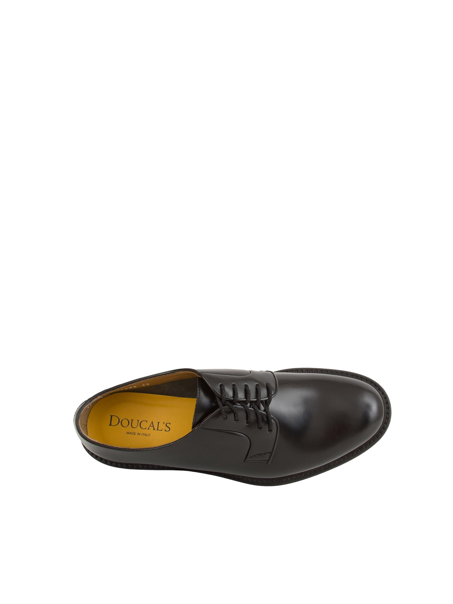Brand: DOUCAL'SScarpa stringata uomo Doucal's modello Derby a cinque fori realizzata in pelle nera, con tomaia senza cuciture e forme arrotondate, adatta ad ogni tipo di occasione. La lavorazione Blake rende la scarpa resistente e morbida nella calzata. Suola in cuoio nell'iconico giallo Golden Cream con mezza piantina in gomma.