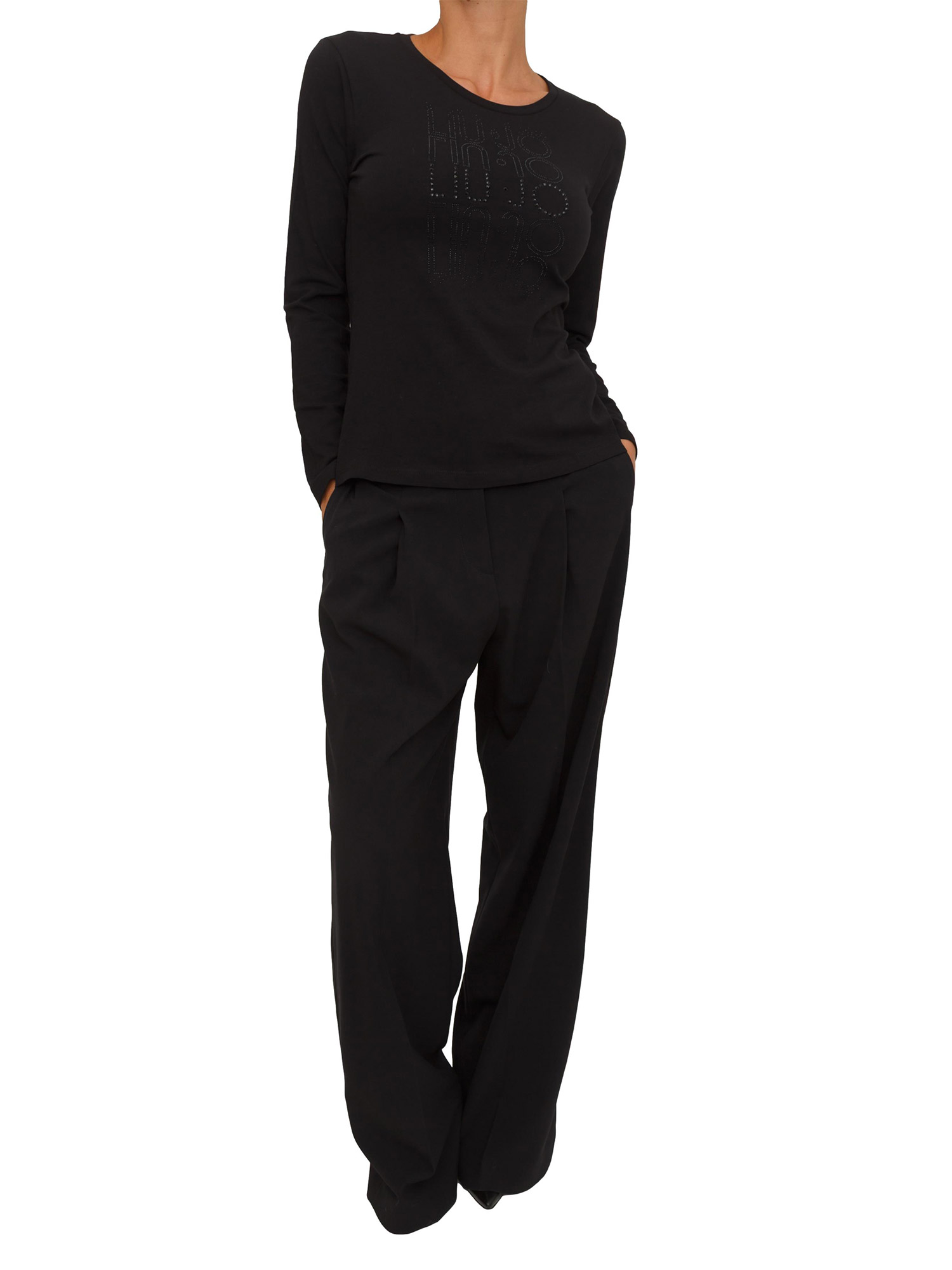 Brand: LIU JOT-shirt Liu Jo donna realizzata in jersey di cotone stretch con logo strass sul davanti. Modello girocollo con maniche lunghe e vestibilità regular. Perfetta sotto ogni blazer. La modella è alta 1.72 e indossa la taglia XS.