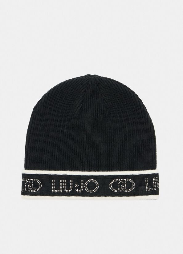 Berretto Liu Jo in maglia a costine nera con logo strass