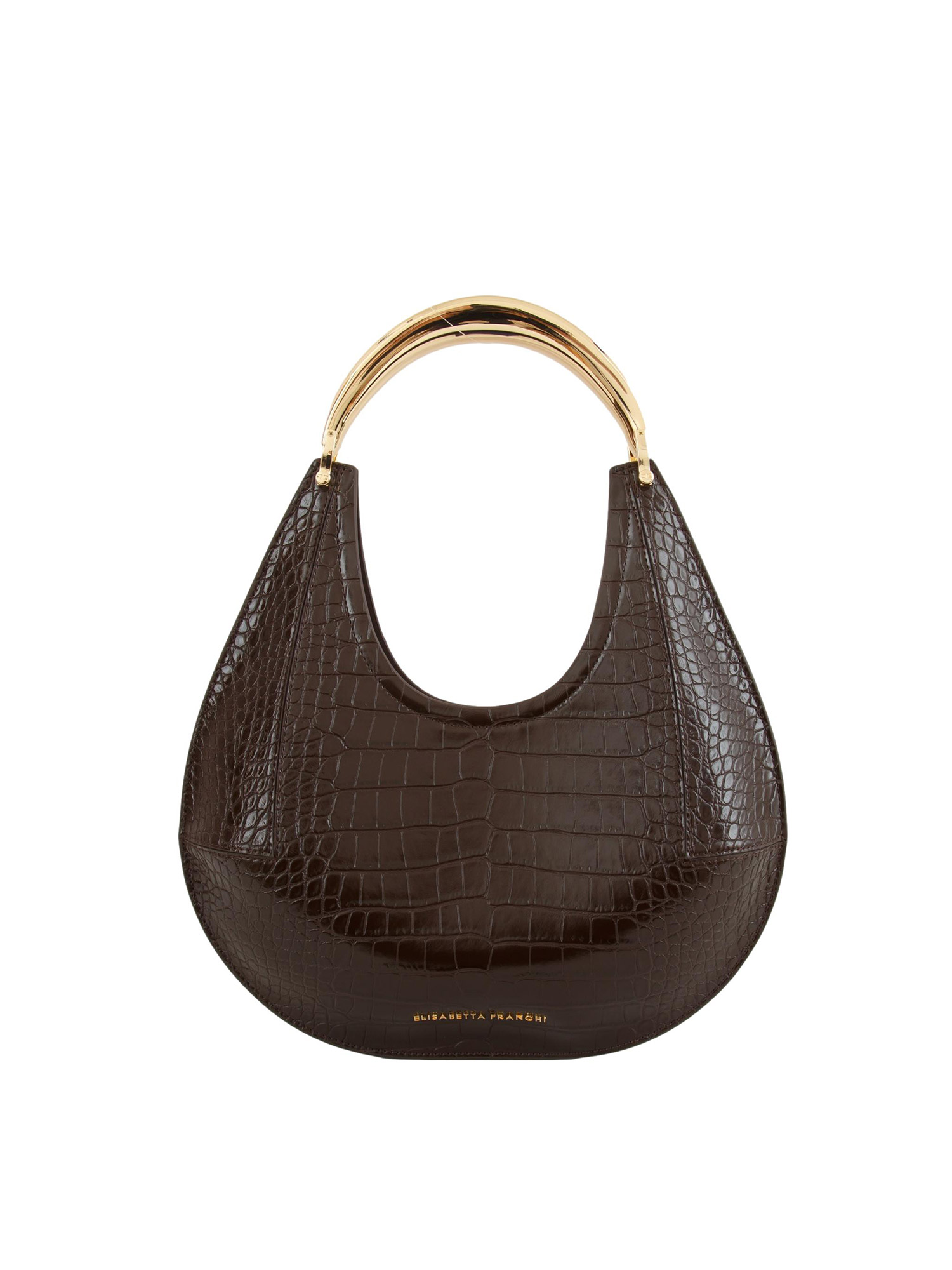 Brand: ELISABETTA FRANCHIBorsa hobo media Elisabetta Franchi realizzata in materiale sintetico effetto pelle. La texture con stampa cocco dona carattere all'accessorio, impreziosito dal manico gioiello in metallo dorato. Logo al fondo. Dimensioni: 35 x 39 cm.