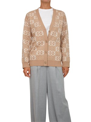 Cardigan over Pinko in morbida lana con logo all over a contrasto bianco e nero