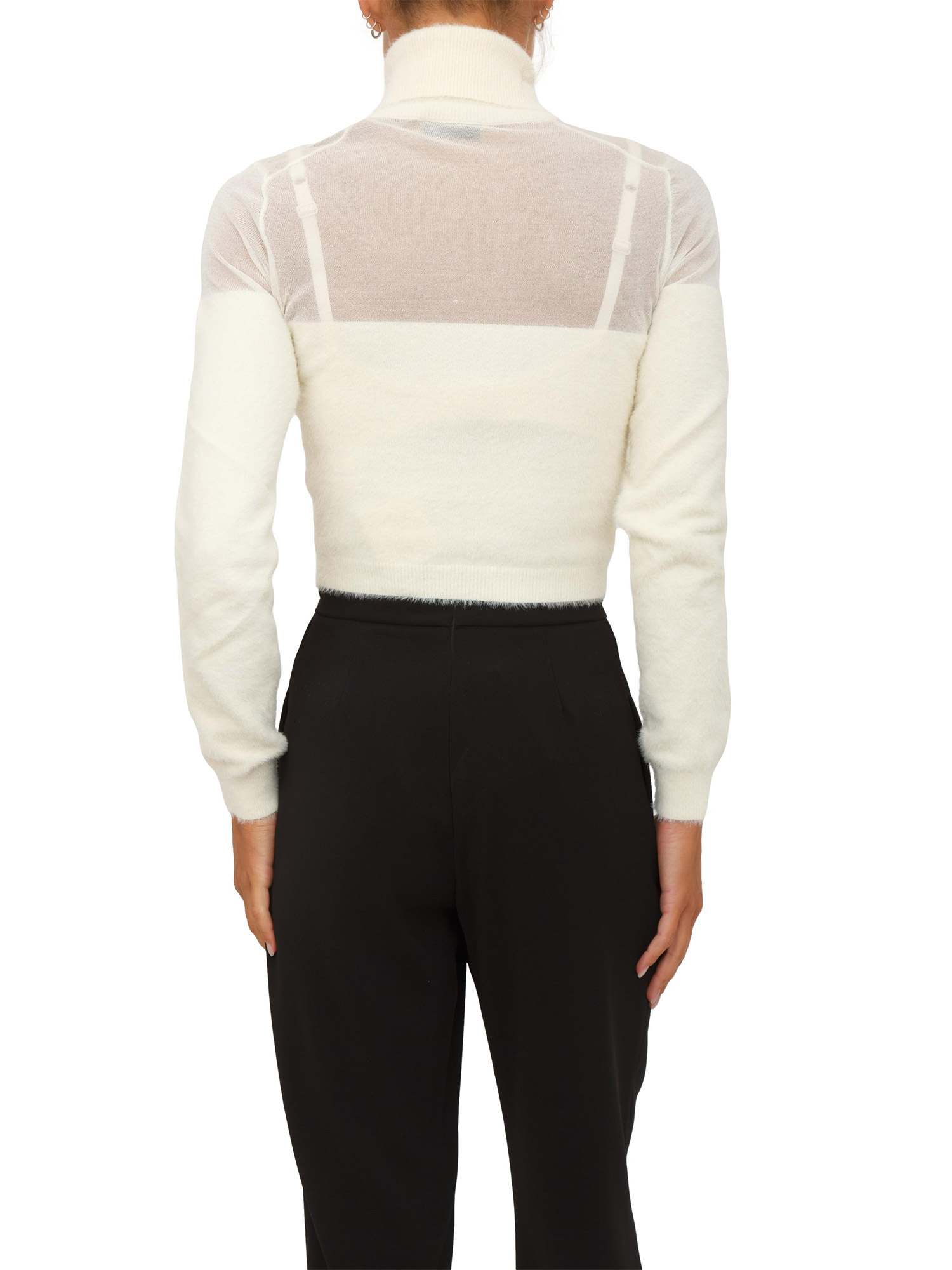 Brand: ELISABETTA FRANCHIDolcevita cropped Elisabetta Franchi con vestibilità aderente. Particolare lavorazione con texture effetto pelo e trama garzata sulle spalle che crea morbidi giochi di trasparenze. Impreziosito dal dettaglio con logo, illuminato da piccoli strass. La modella è alta 1.72 e indossa la taglia 42.