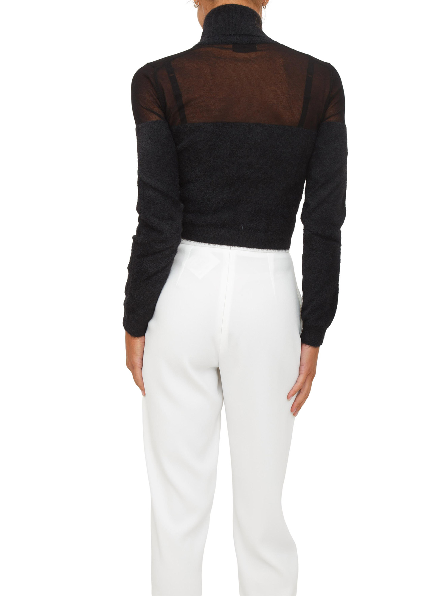 Brand: ELISABETTA FRANCHIDolcevita cropped Elisabetta Franchi con vestibilità aderente. Particolare lavorazione con texture effetto pelo e trama garzata sulle spalle che crea morbidi giochi di trasparenze. Impreziosito dal dettaglio con logo, illuminato da piccoli strass. La modella è alta 1.72 e indossa la taglia 42.