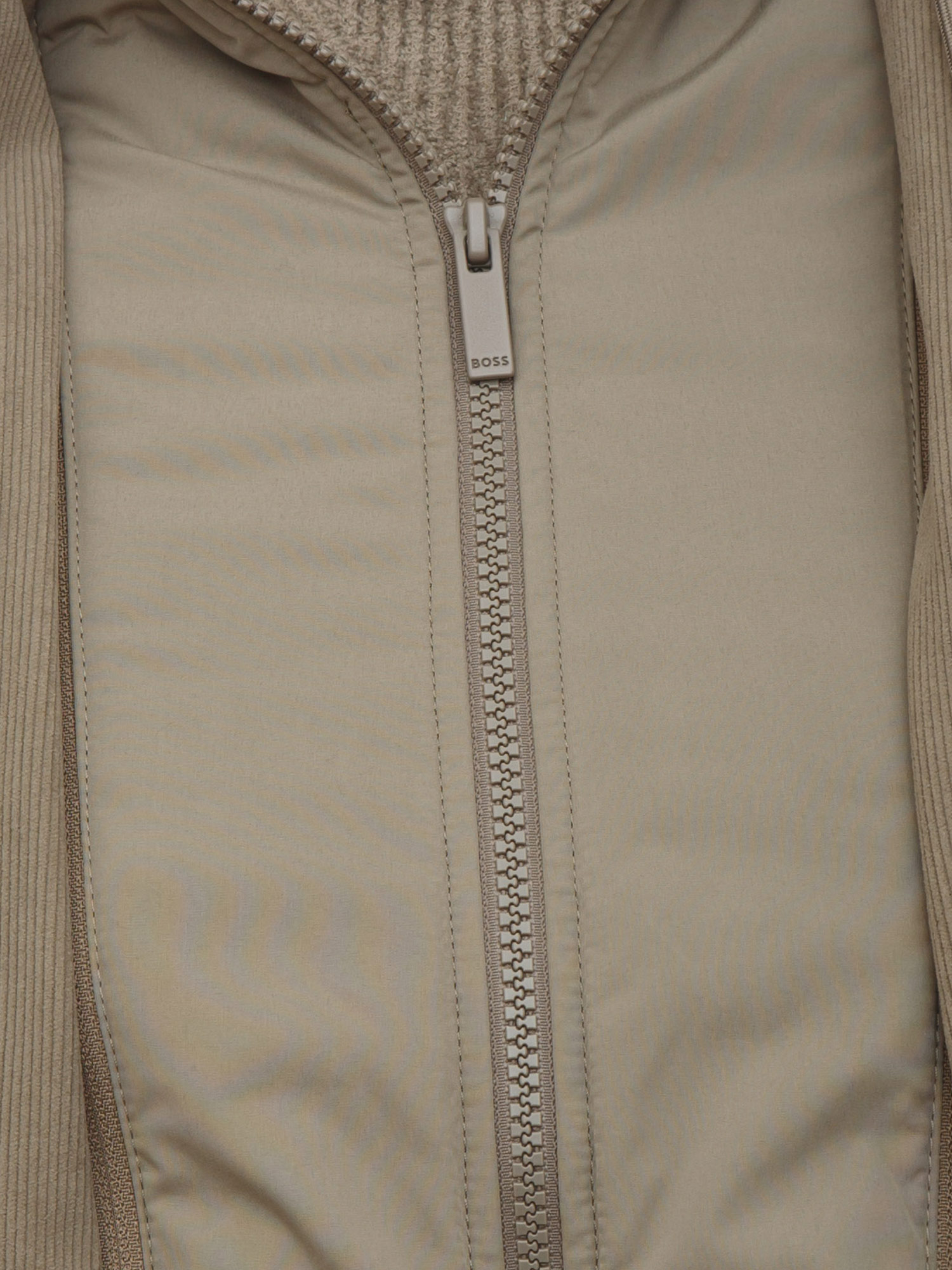 Brand: BOSSIn velluto a coste e tessuto elasticizzato, questa giacca giubbotto BOSS Uomo dal taglio slim fit è una scelta versatile. Dotata di revers classico, chiusura con bottone, tasche laterali e pettorina felpa con cappuccio e zip integrata che si può staccare. Il modello è alto 1.90m e indossa la taglia 50.
