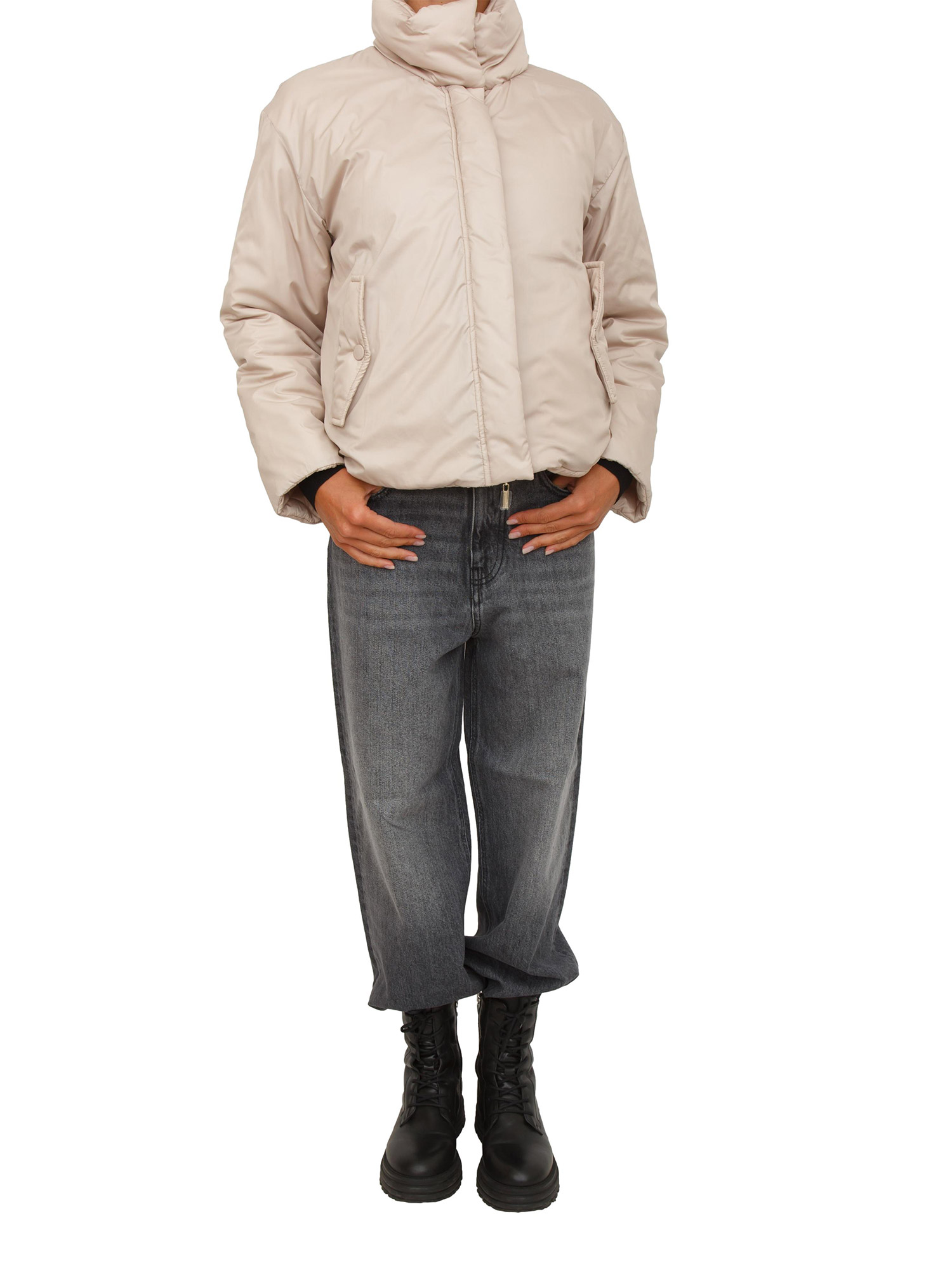 Brand: IBLUESGiubbino reversibile iBlues realizzato in tessuto tecnico antigoccia dalla linea dritta con coulisse in fondo. Collo alto, maniche lunghe, tasche laterali e chiusura zip a doppio cursore e bottoni. La modella è alta 1.72 e indossa la taglia 42.