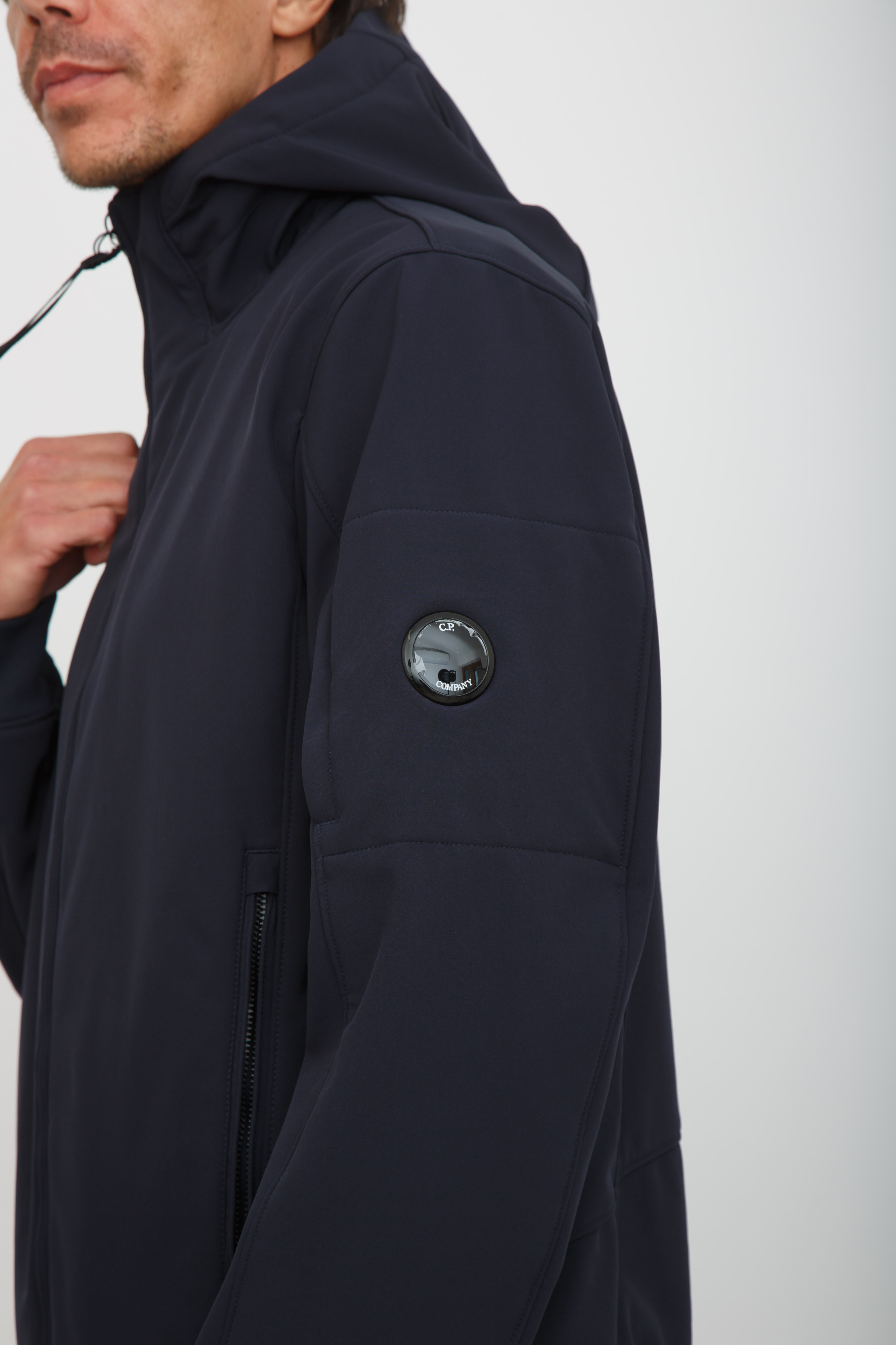 Brand: C.P. COMPANYGiubbino uomo C.P. Company con cappuccio realizzato in C.P. Shell-R, un softshell stretch a 3 strati certificato antipioggia e antivento. Dotato di chiusura full zip a doppio cursore, tasche laterali con zip e l’iconica Lente. Regular fit. Il modello è alto 1.90m e indossa la taglia XL.