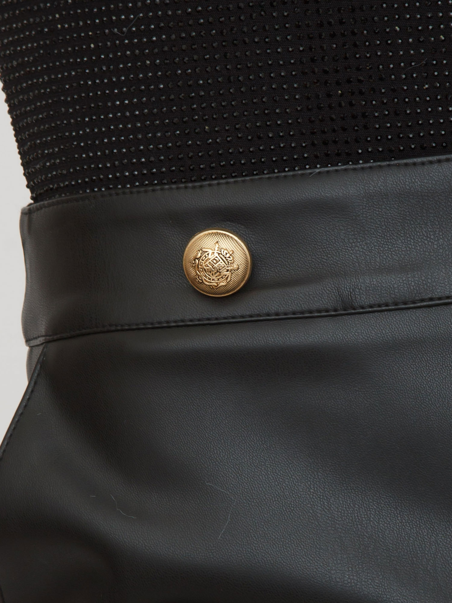 Brand: KOCCALo stile minimal di questa gonna corta Mariaelisa firmata Kocca è impreziosito dal tessuto in ecopelle e da due bottoni dorati in vita che regalano stile e carattere al capo. La modella è alta 1.72 e indossa la taglia 38.