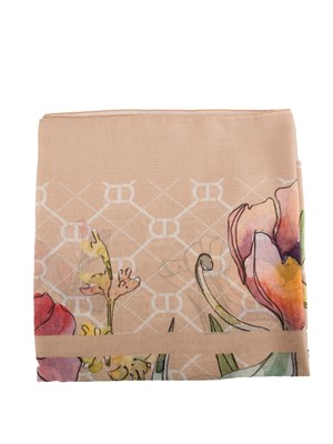 Brand: TWIN-SETKefiah fantasia Twinset con stampa logo Oval T e fiori multicolor, profili a tinta unita con logo lettering. Bellissima come coprispalle o come foulard. Dimensioni: 120x120 cm