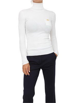 Brand: ELISABETTA FRANCHIMaglia a costine Elisabetta Franchi dalla vestibilità aderente. Con collo dolcevita e maniche con bottoni al fondo, è personalizzata dal taschino in raso con dettaglio logo che regala una nota di luce. La modella è alta 1.72 e indossa la taglia 38.
