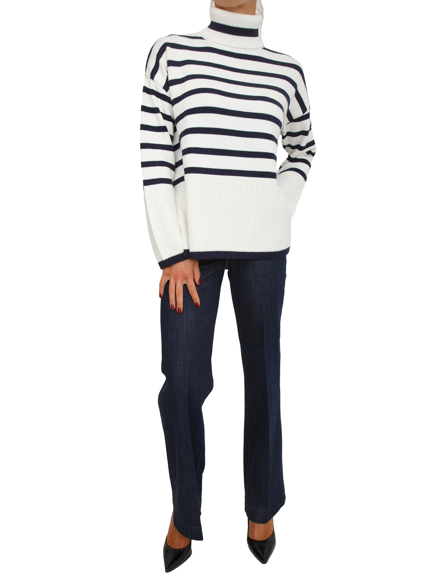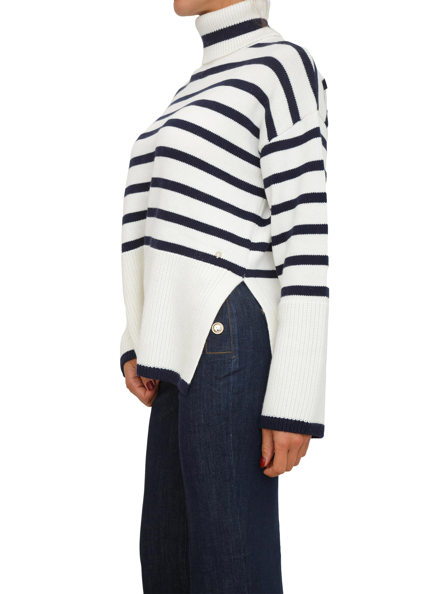 Brand: GUESS JEANSMaglione Guess Jeans donna realizzato in misto cotone e lana con motivo a righe orizzontali bicolor. Collo alto, maniche lunghe e spalle scese per un look urban grintoso. La modella è alta 1.72 e indossa la taglia XS.
