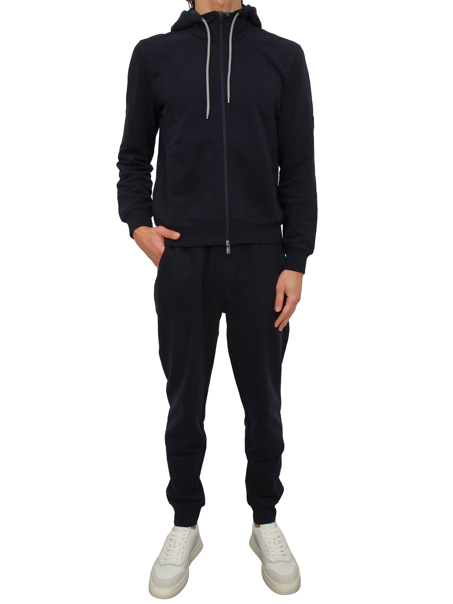 Brand: CORNELIANIPantalone tuta Corneliani realizzato in misto cotone con elastico in vita e sul fondo gamba. Design con vestibilità regular, due tasche laterali ed una a filetto dietro. Il modello è alto 1.90m e indossa la taglia 50.