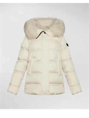 Piumino trapuntato in tessuto superleggero e compatto, realizzato in 100% poliestere riciclato post consumo, con finitura semi-opaca e touch ultra morbido. Cappuccio con pelliccia di volpe staccabile.