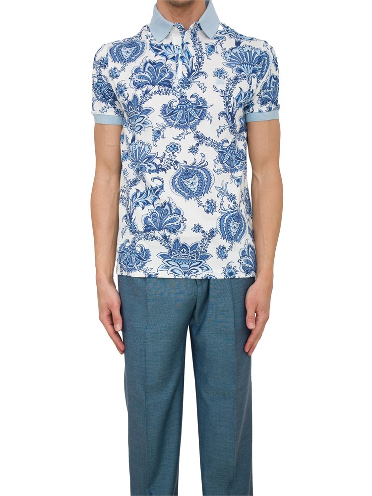 Brand: ETROPolo Etro uomo in puro cotone decorata con un motivo a maxi fiori all-over, di cui alcuni arricchiti con il lettering del brand. Colletto e bordo manica in tinta unita. A completare il capo, il Pegaso e il monogram ETRO ricamati ton sur ton sul petto. Il modello è alto 1.90m e indossa la taglia M.