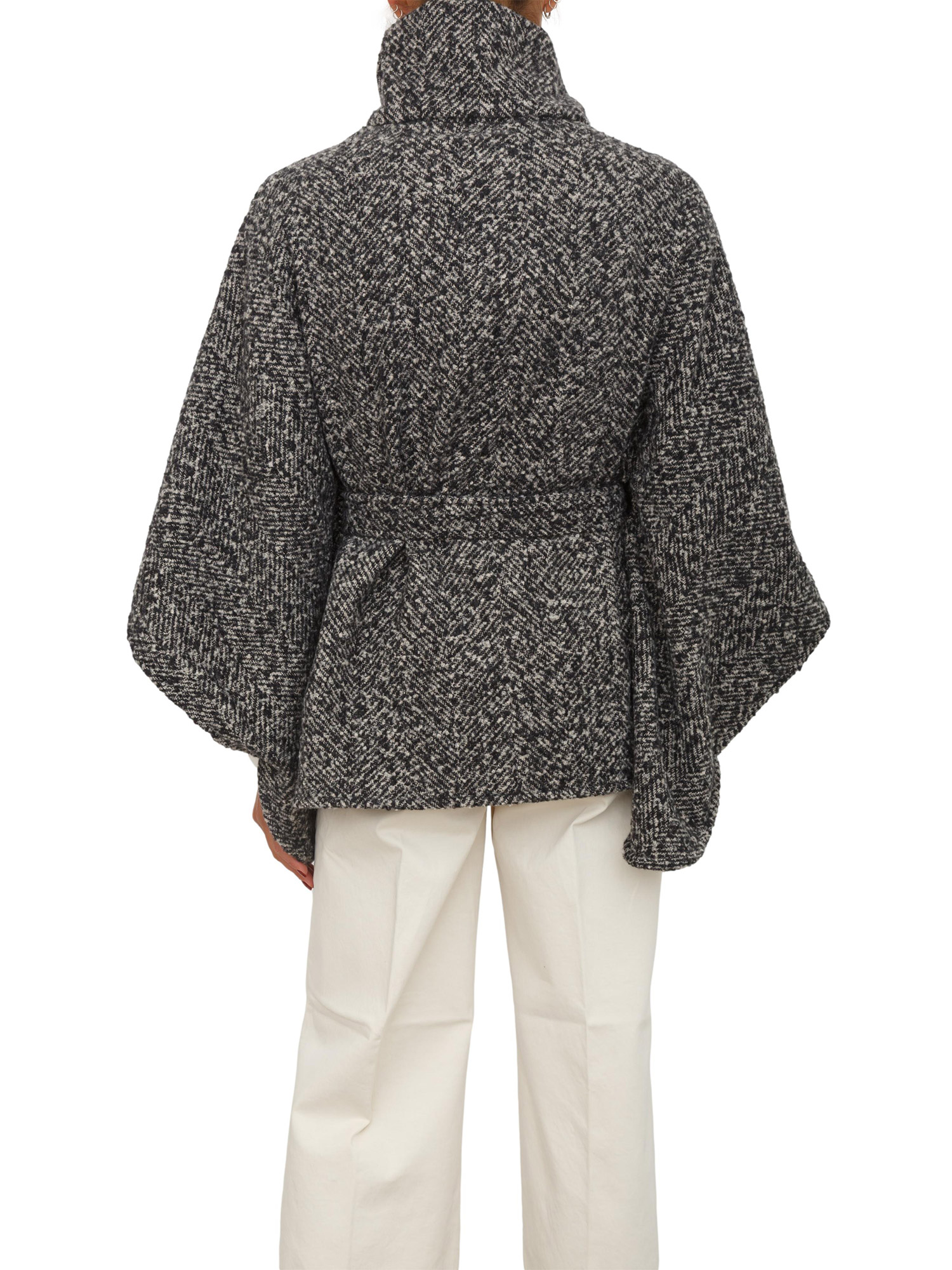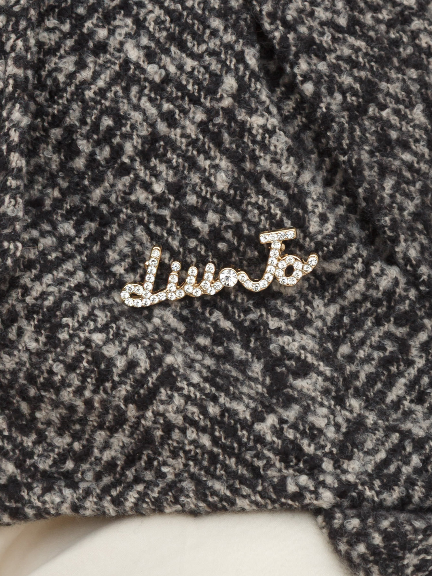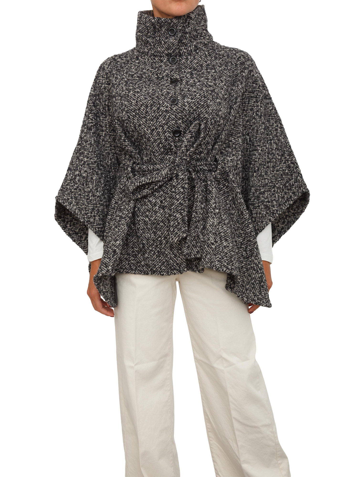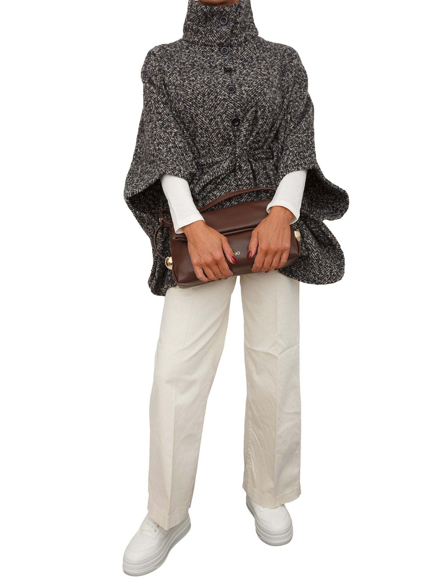 Brand: LIU JOPoncho Liu Jo donna ralizzato in tessuto chevron con collo alto e maniche a kimono. Dotato di chiusura con bottoni, cintura tono su tono e spilla gioiello con logo strass removibile. La modella è alta 1.72 e indossa la taglia TU.