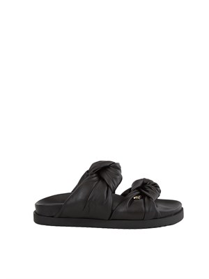 Brand: PATRIZIA PEPESlippers Patrizia Pepe realizzate in nappa soft con fodera in pelle e suola in gomma con logo che assumono le linee di un design ultra stylish. Questo modello è carattierizzato da fasce imbottite con nodo centrale. Il rivetto Fly completa il look con un tocco glam.
