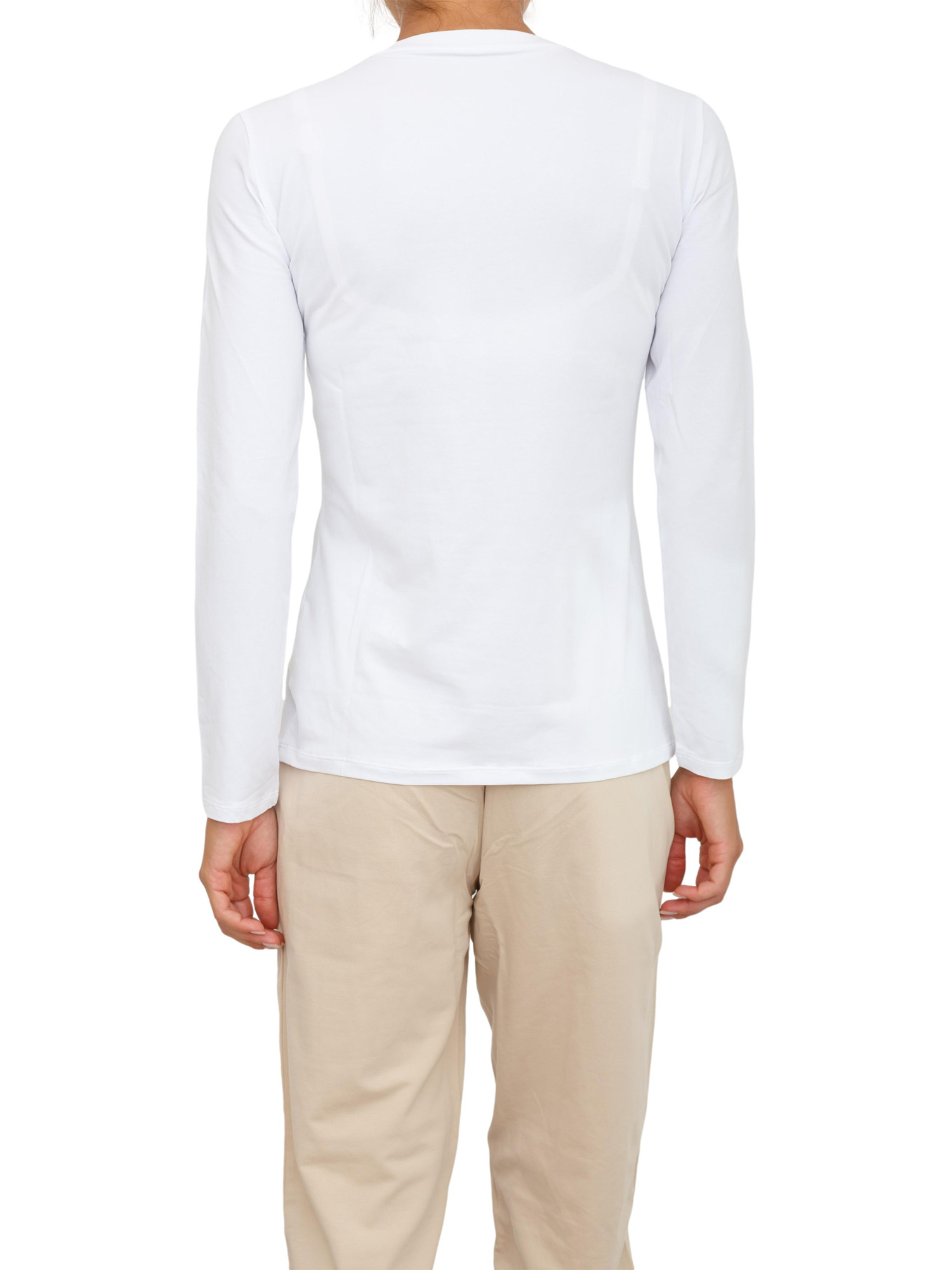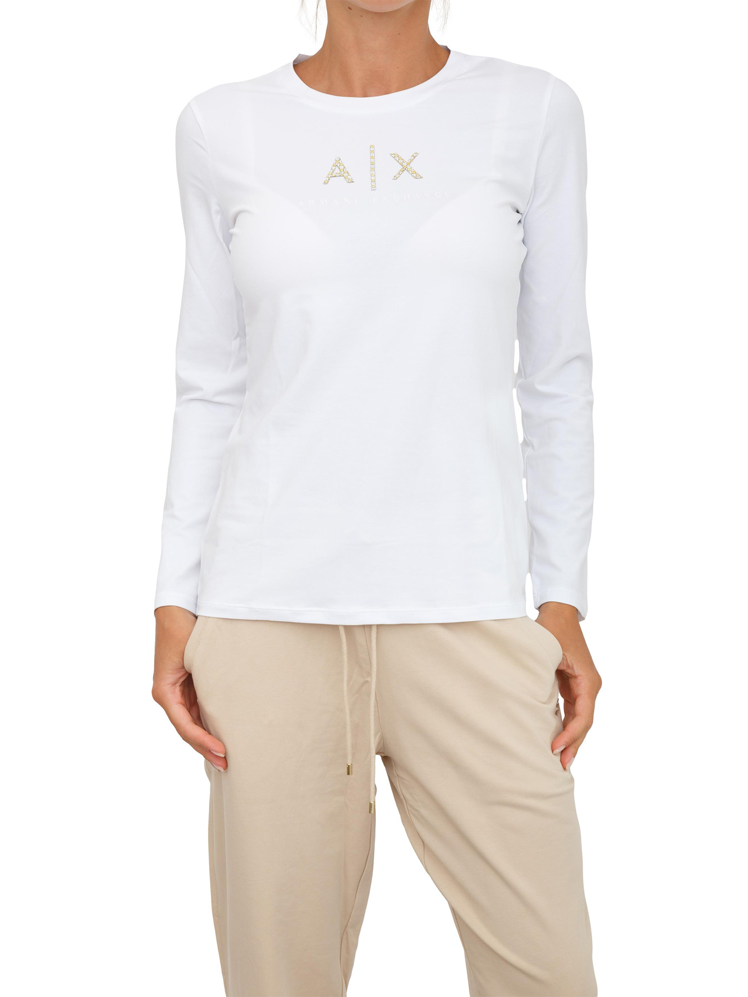 Brand: ARMANI EXCHANGET-shirt donna Armani Exchange realizzata in jersey di cotone con girocollo e maniche lunghe. Design dal fit dritto e comodo con applicazione logo con strass sul davanti. Ideale sia per outfit sportivi che casual. La modella è alta 1.72 e indossa la taglia M.