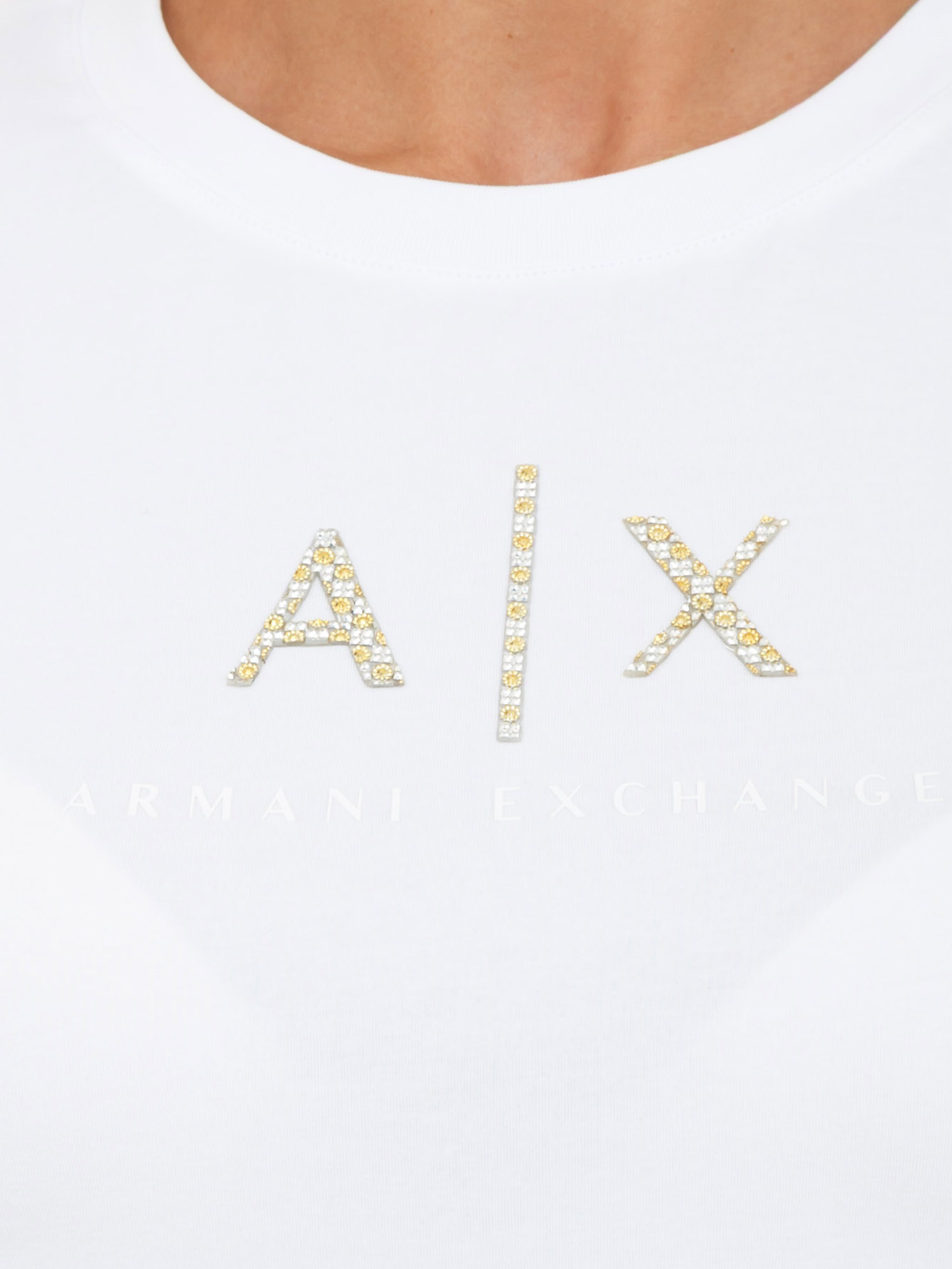 T-shirt donna Armani Exchange in jersey di cotone bianco con logo strass oro