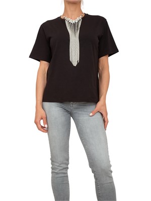 Brand: BLUGIRLKey-piece trasversale del guardaroba. T-shirt Blugirl in cotone stretch con collana rimovibile di cristalli con frange in catena, collo tondo, maniche corte con spalle scese, linea regular. Da interpretare come vuoi a seconda dell'occasione. La modella è alta 1.72 e indossa la taglia XS.
