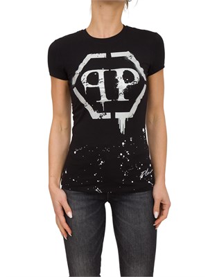 Brand: PHILIPP PLEINT-shirt di jersey di cotone impreziosita da motivi stampati e arricchita da cristalli, l'iconico PP Hexagon è stampato sul fronte con applicazioni di cristalli con effetto colato, girocollo smacchinato a costina e i bordi sono rifiniti a due aghi.