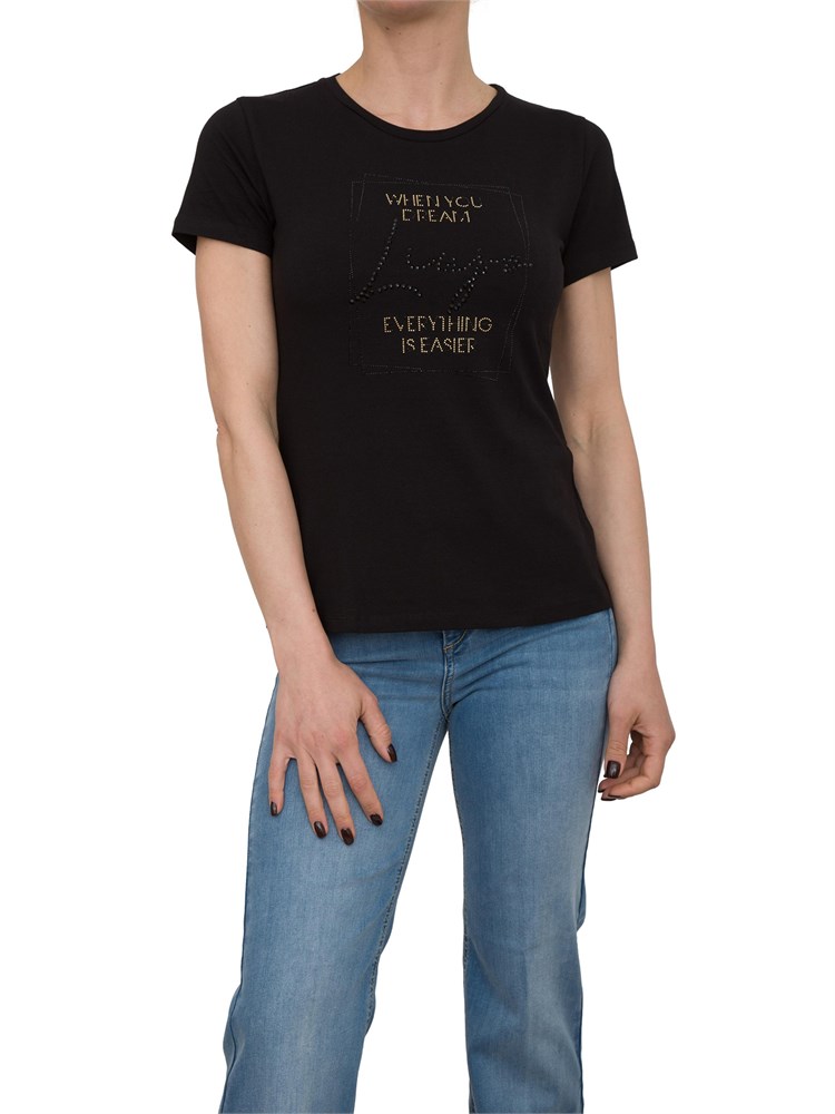 Brand: LIU JOCon una luminosa tonalità nera questa t-shirt Liu Jo donna in jersey di cotone celebra la leggerezza dell[and]rsquo;estate. Il maxi logo spicca con tono deciso sul modello essenziale e versatile, per vestire di glam i tuoi momenti di svago.La modella è alta 1.72 e indossa la taglia S.
