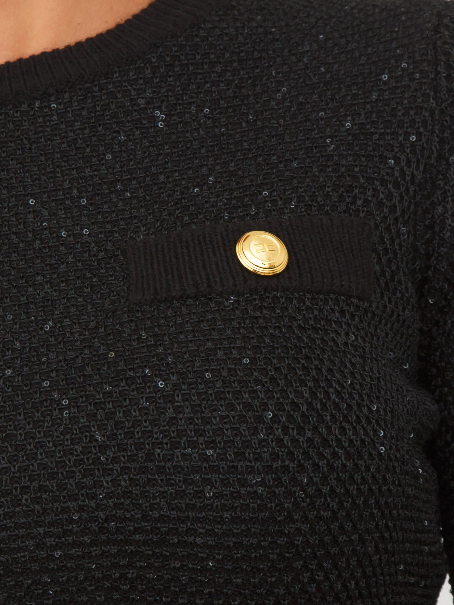 Brand: ELISABETTA FRANCHITop in maglia Elisabetta Franchi con girocollo e maniche lunghe. Fit aderente e texture con paillettes che donano riflessi preziosi. Rifinito con filetti e bordi lavorati a costine, ha bottoni gioiello con logo per un'ultima nota luminosa. La modella è alta 1.72 e indossa la taglia 40.