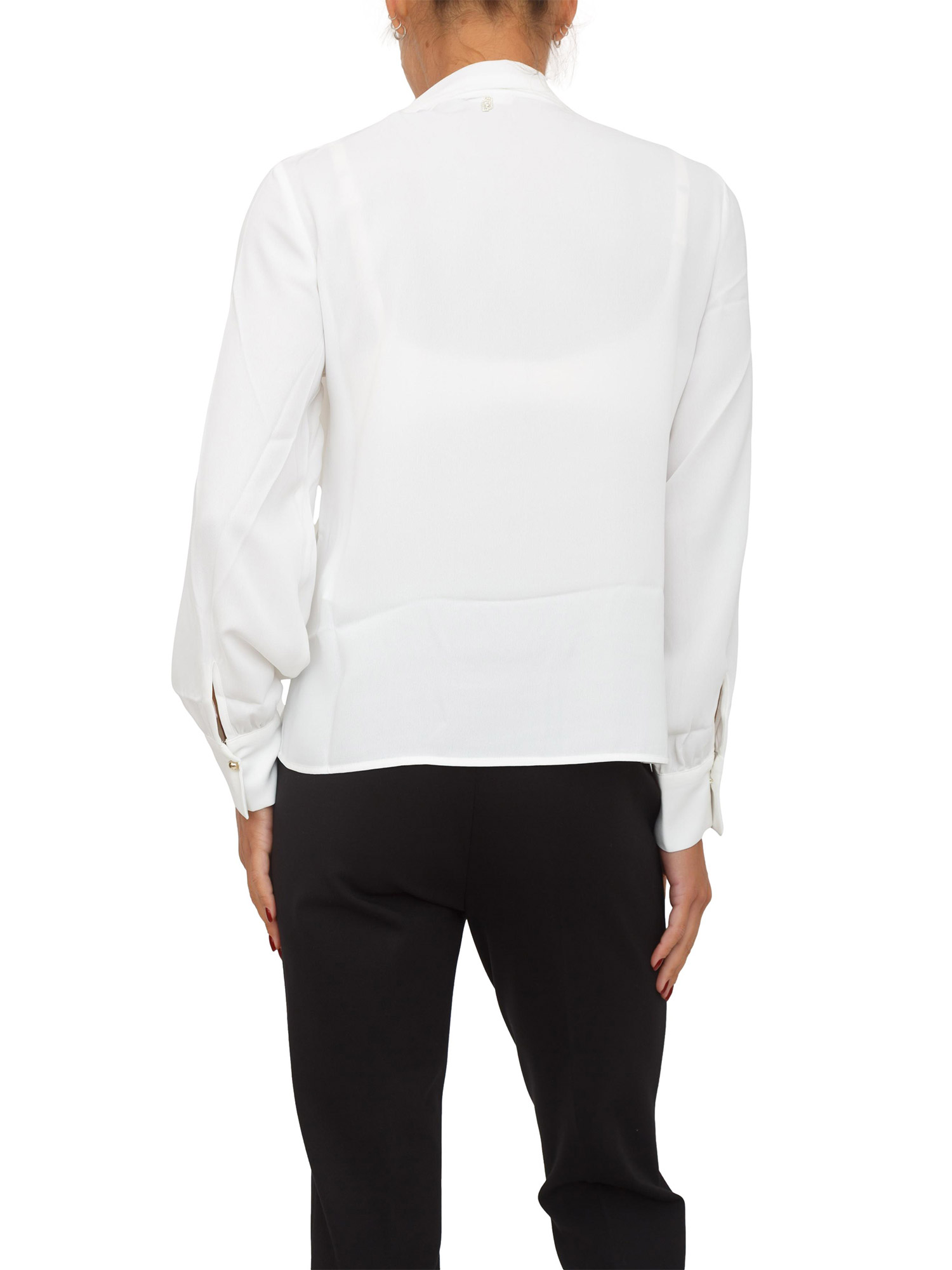 Brand: LIU JOBlusa elegante Liu Jo donna realizzata in crêpe con vestibilità morbida. Design con taglio accollato con foulard, da annodare a fiocco per un effetto romantico, e bottoni logati su spalle e polsi. La modella è alta 1.72 e indossa la taglia 40.
