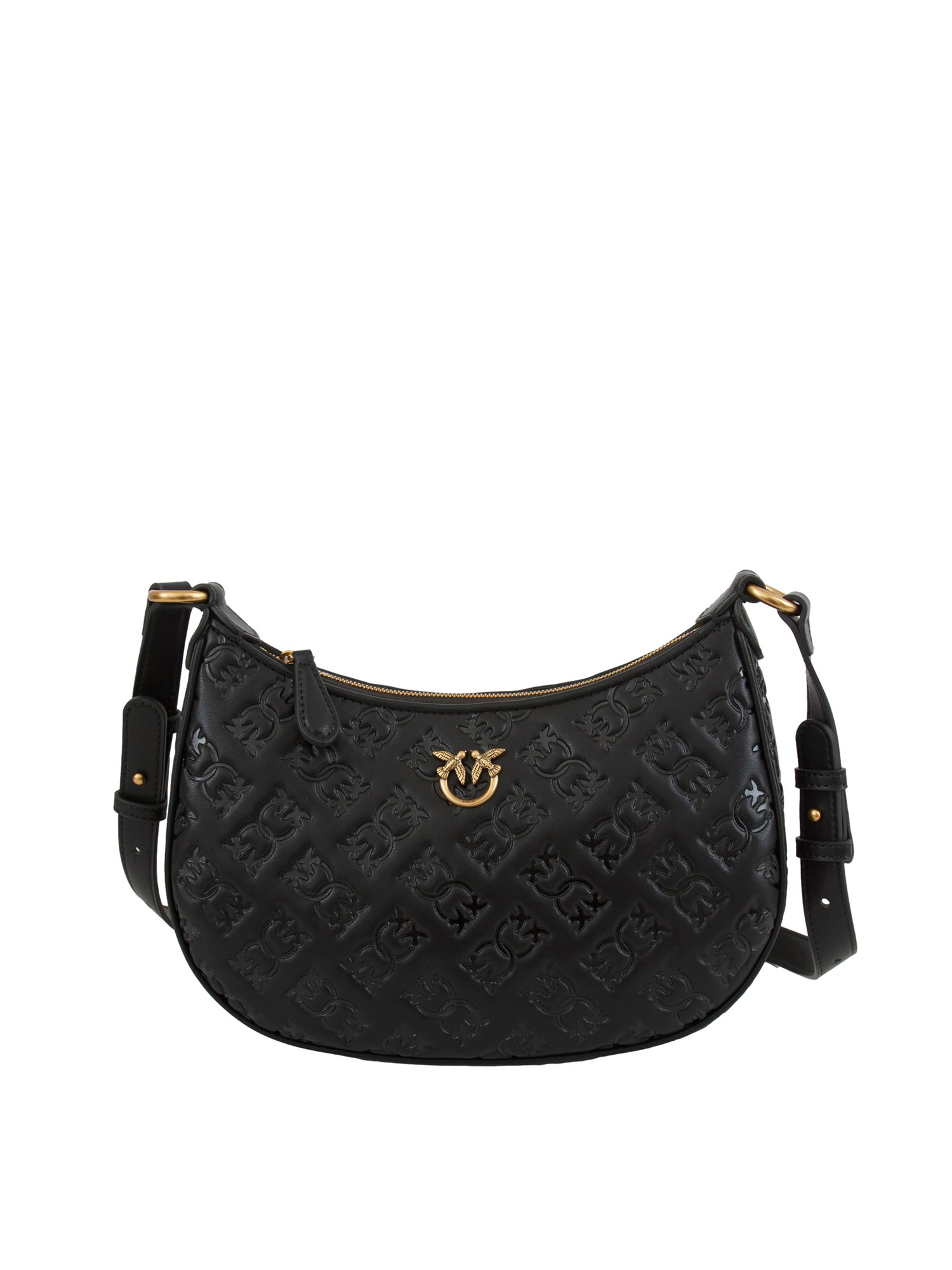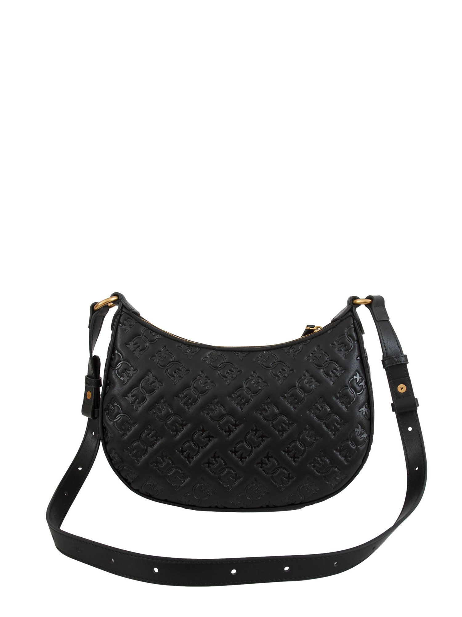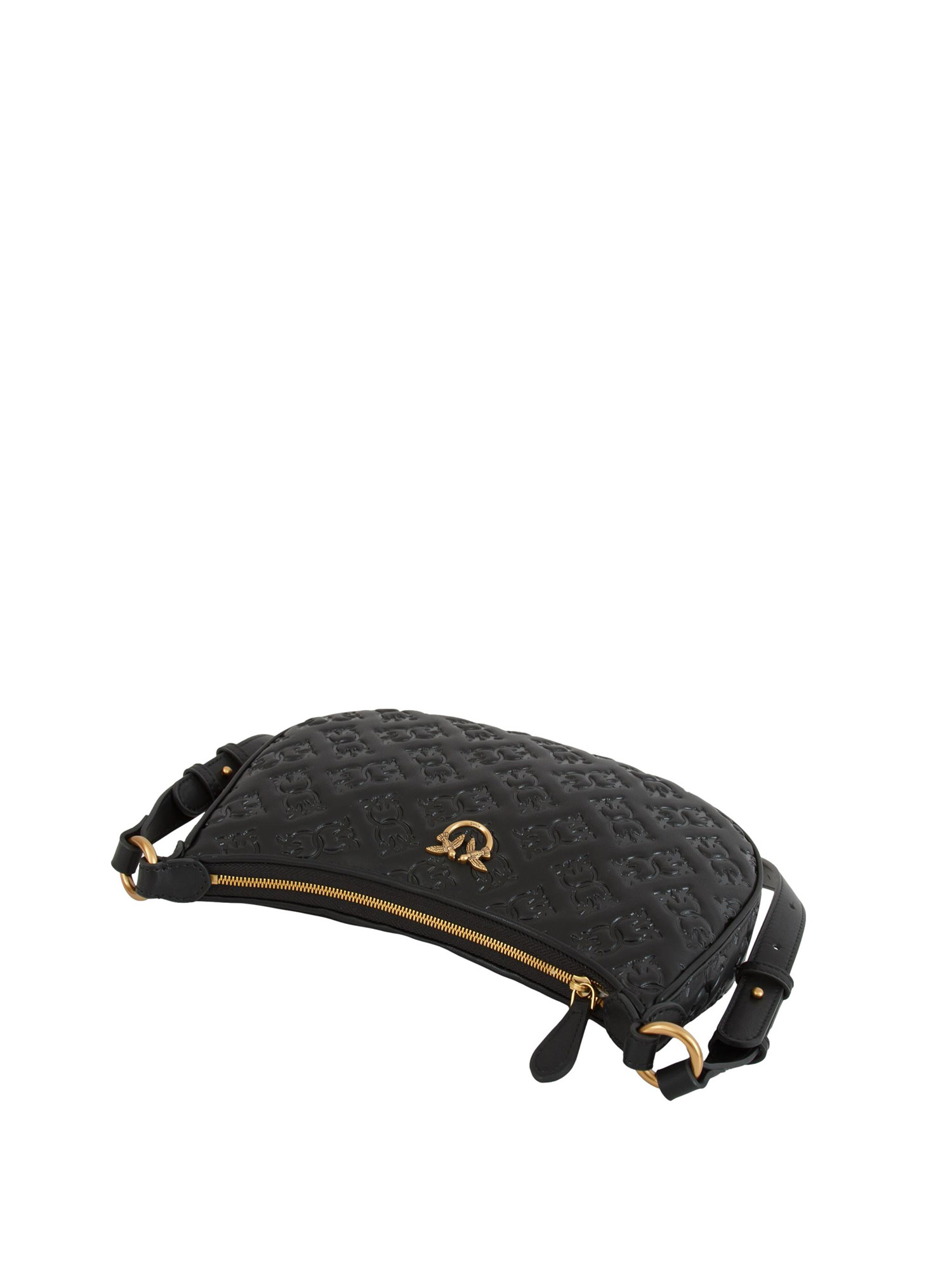 Brand: PINKOBorsa Mini Love Bag Half Moon Pinko con forma a mezzaluna in morbida pelle mano seta con logo all over e placchetta Love Birds Diamond Cut in galvanica antique gold. Interno foderato in microfibra scamosciata e tracolla in pelle per la portata a spalla. Chiusura con zip. Dimensioni: 26x18x6 cm