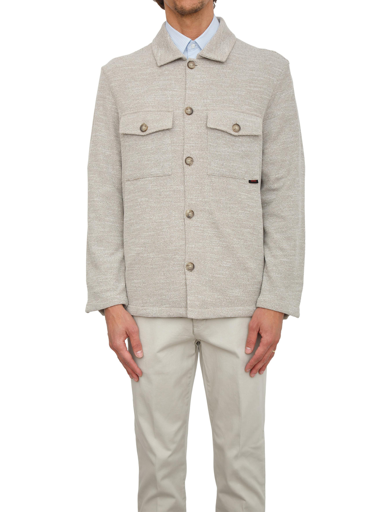 Brand: LIU JOCamicia overshirt Liu Jo uomo modello a giacca realizzata in maglia di misto cotone con patch ricamata sui gomiti. Colletto alla francese, tasche con patta sul petto, e chiusura con bottoni. Il modello è alto 1.90m e indossa la taglia L.