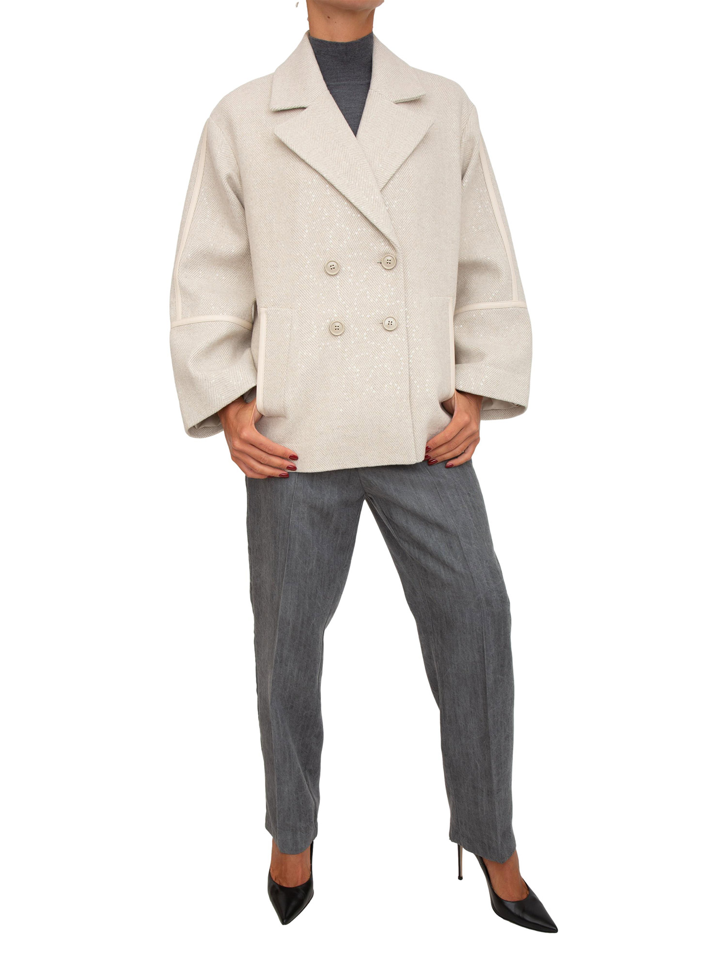 Brand: LIU JOCaban Liu Jo realizzato in misto lana con paillettes sur ton all over. Modello cocoon con collo a revers, chiusura doppiopetto, tasche laterali ed inserti in ecopelle sur ton. La modella è alta 1.72 e indossa la taglia 40.