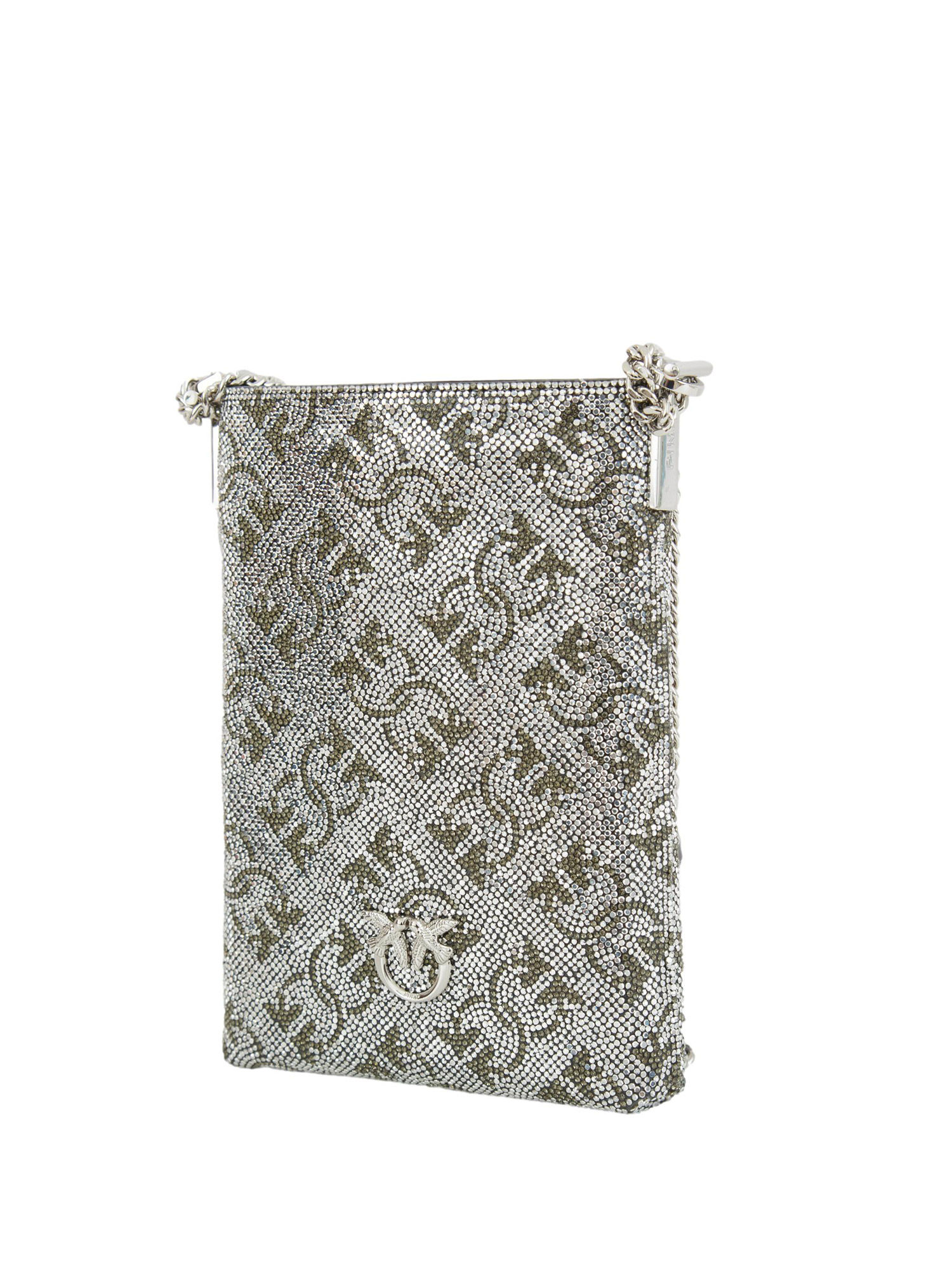 Brand: PINKOCustodia per smartphone Pinko in pelle, rivestita interamente di strass con monogramma Love Birds e dotata di una tasca posteriore, da indossare al collo o a tracolla grazie all'apposita catena. Alleato ideale da portare con te nei tuoi viaggi. Dimensioni: 12x17x3 cm.