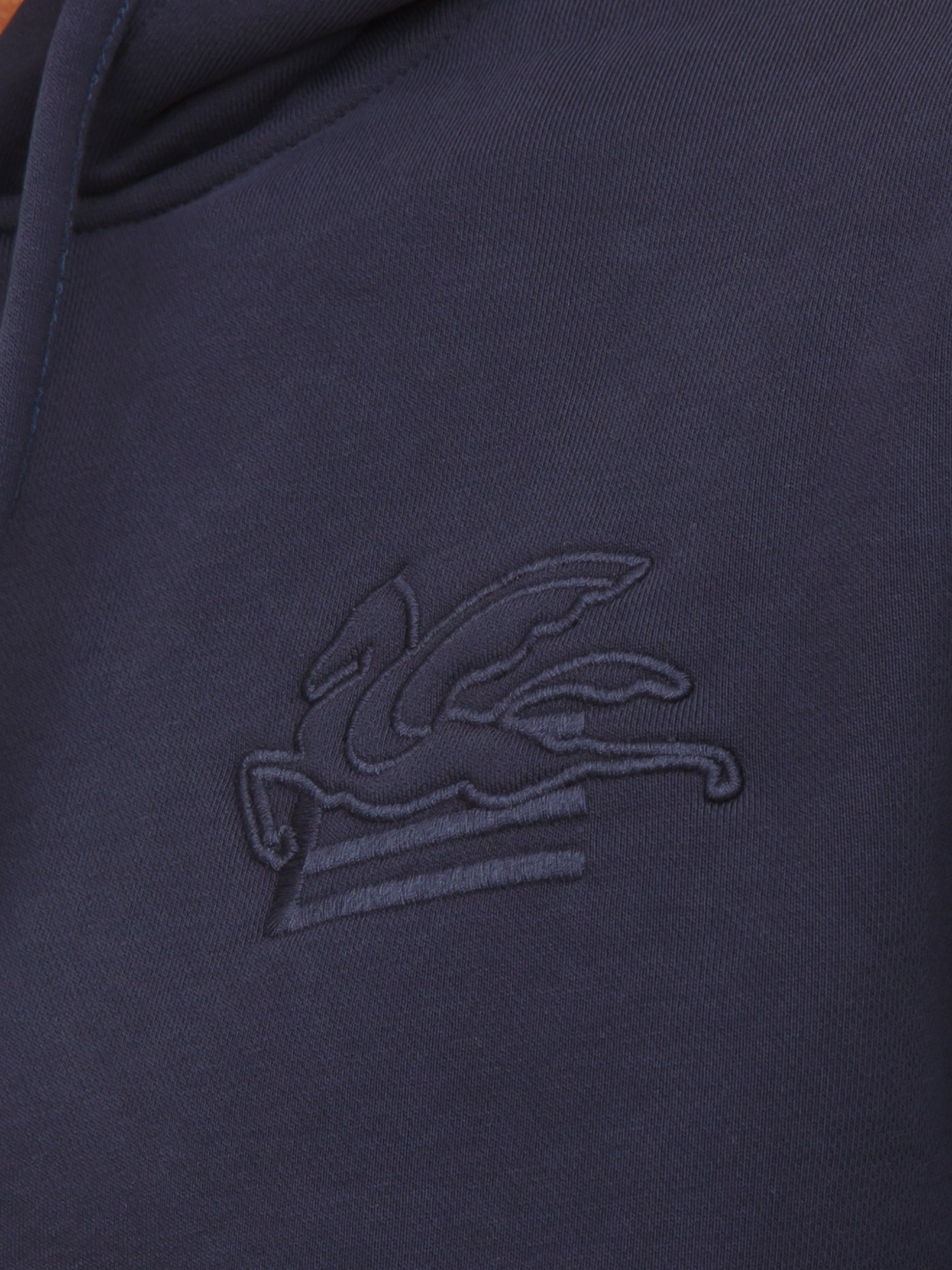 Brand: ETROFelpa con cappuccio Etro uomo realizzata in misto cotone con logo Pegaso ricamato ton sur ton sul petto. Vestibilità regular, cappuccio con coulisse e polsini e fondo lavorati a costine. Il modello è alto 1.90m e indossa la taglia M.