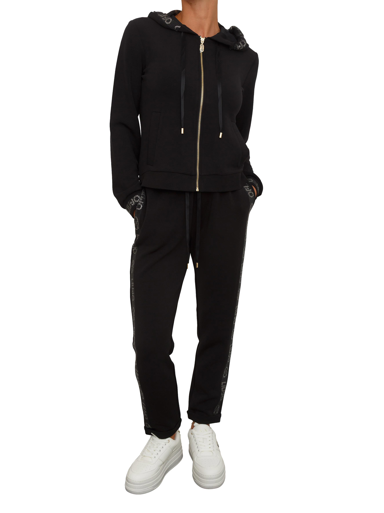 Brand: LIU JOFelpa Liu Jo donna realizzata in cotone con cappuccio e maniche con bordo lovorato con strass logo. Dotata di zip, cappuccio con coulisse con lacci e tasche laterali. La modella è alta 1.72 e indossa la taglia XS.