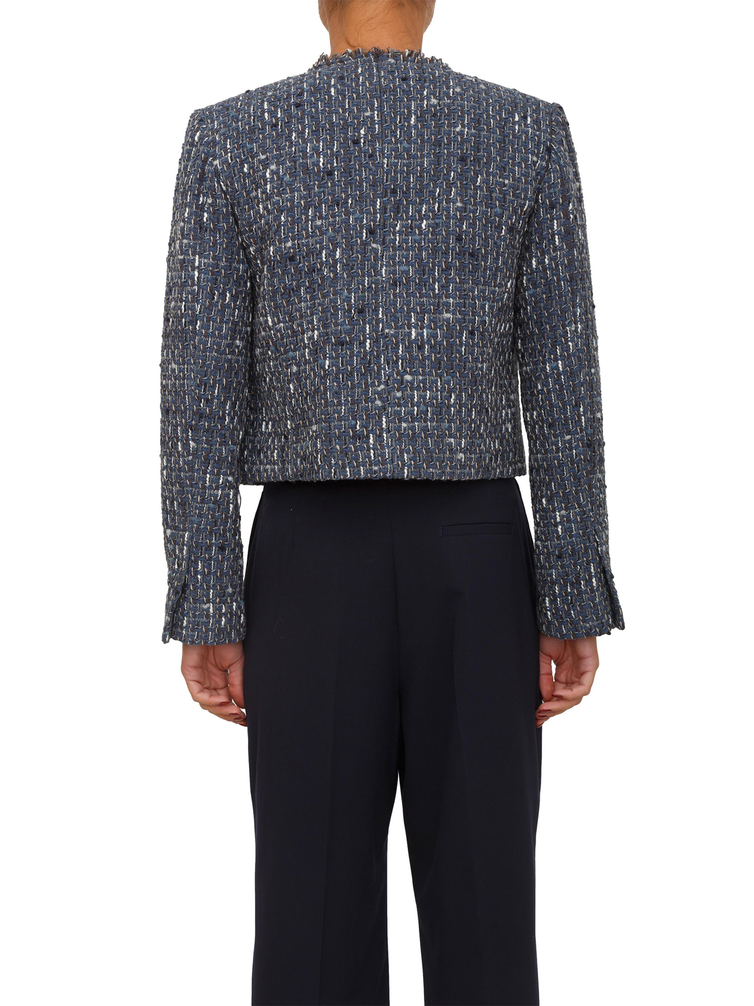 Brand: LIU JOGiacca monopetto Liu Jo donna realizzata in bouclé di misto cotone e lana con perle applicate. Modello con taglio girocollo, bordi sfrangiati, polsi con spacchetto e tasche con patta. La modella è alta 1.72 e indossa la taglia 40.