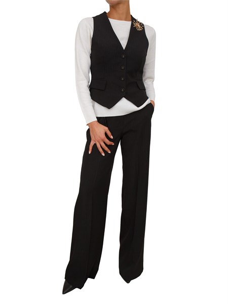 Brand: MARELLAGilet in saglia fluida effetto resca, fit aderente con lunghezza in vita, scollo a V, chiusura con bottoni e dettaglio gioiello, retro con finta martingala e tasche a filetto sui fianchi. La modella è alta 1.72 e indossa la taglia 42.