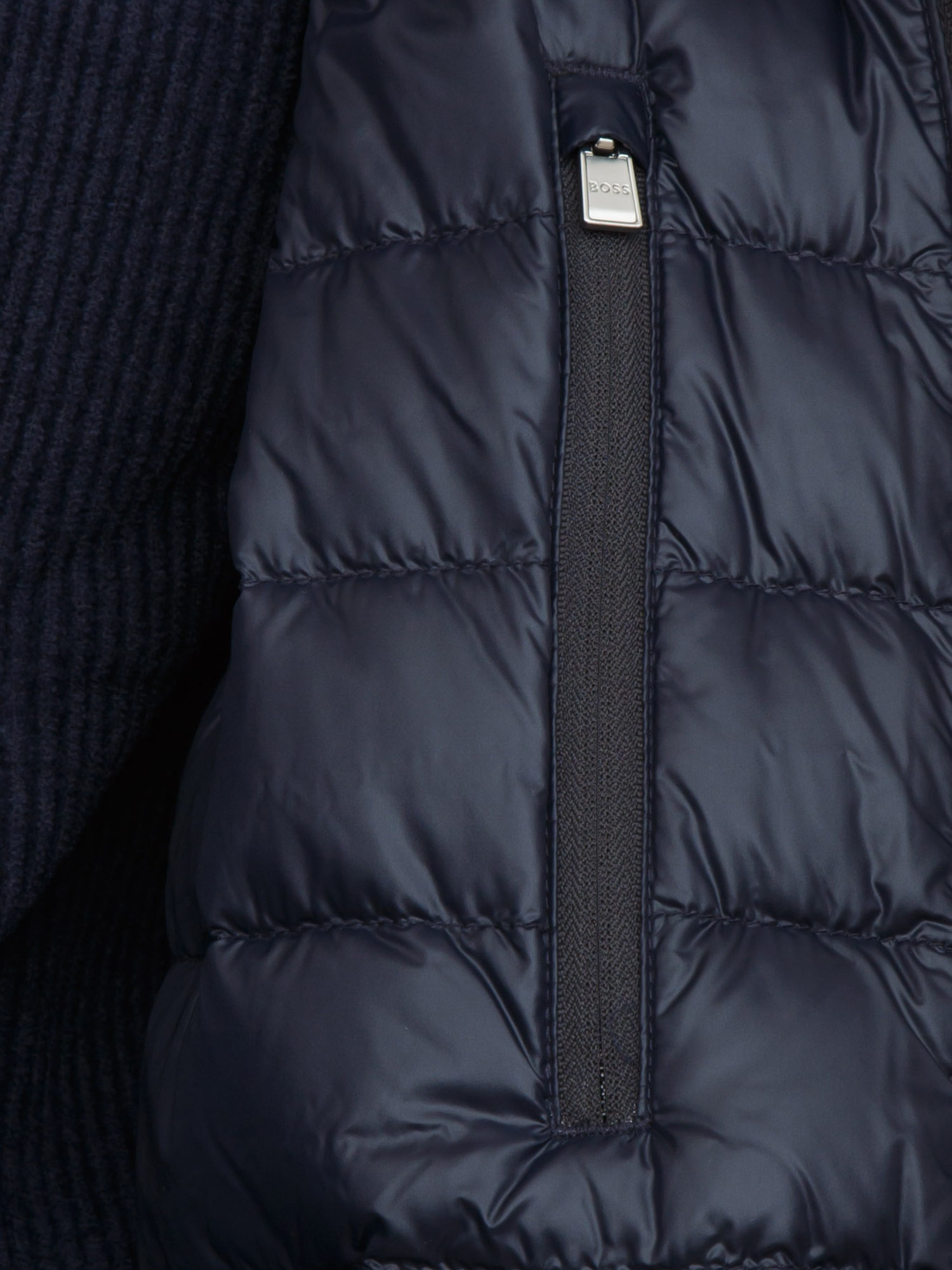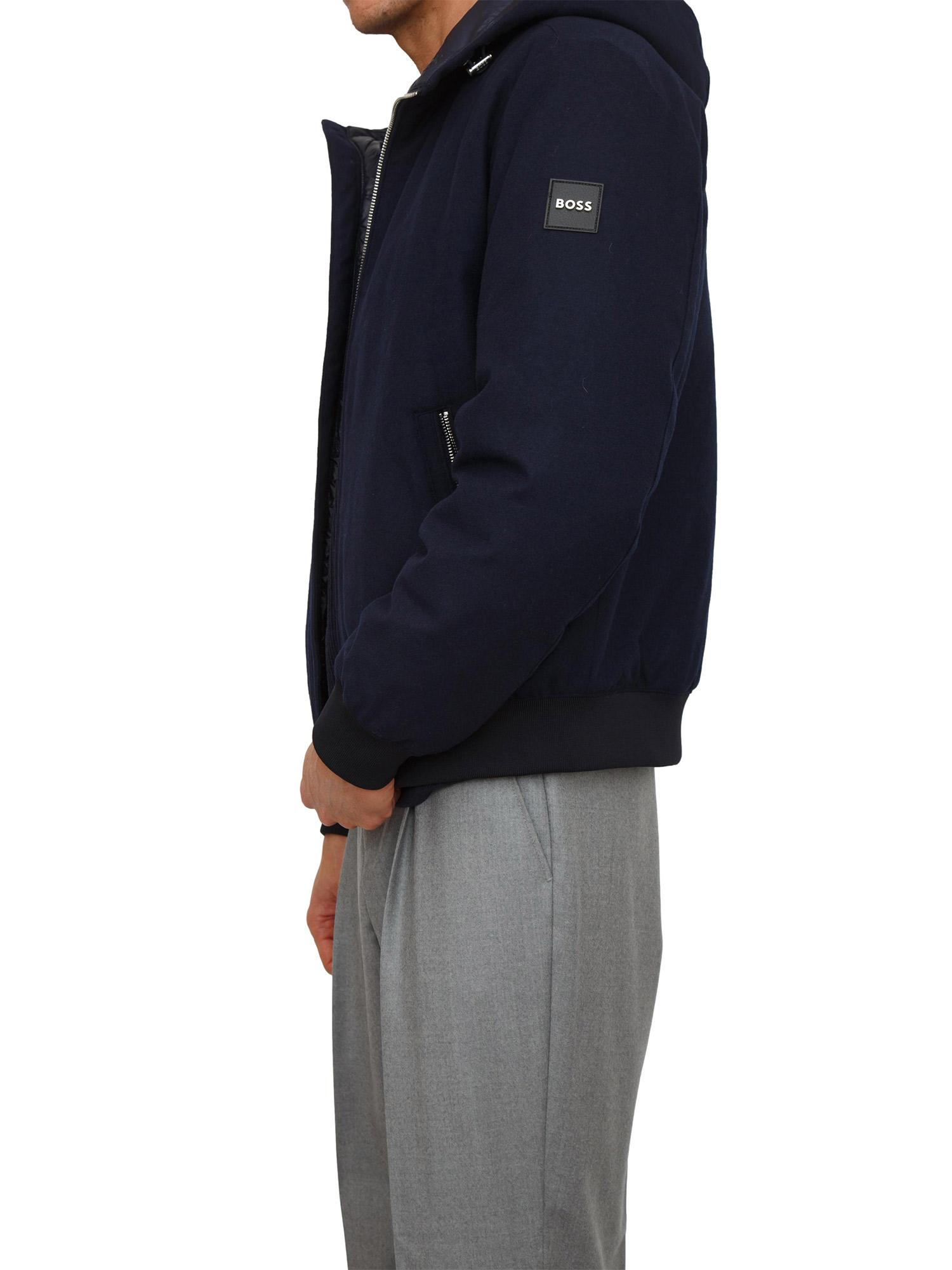 Brand: BOSSGiubbotto Boss uomo realizzato in tessuto idrorepellente con imbottitura interna. Design full zip, cappuccio, tasche laterali con zip e fondi lavorati a costine. Il modello è alto 1.90m e indossa la taglia 50.