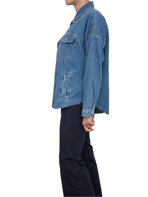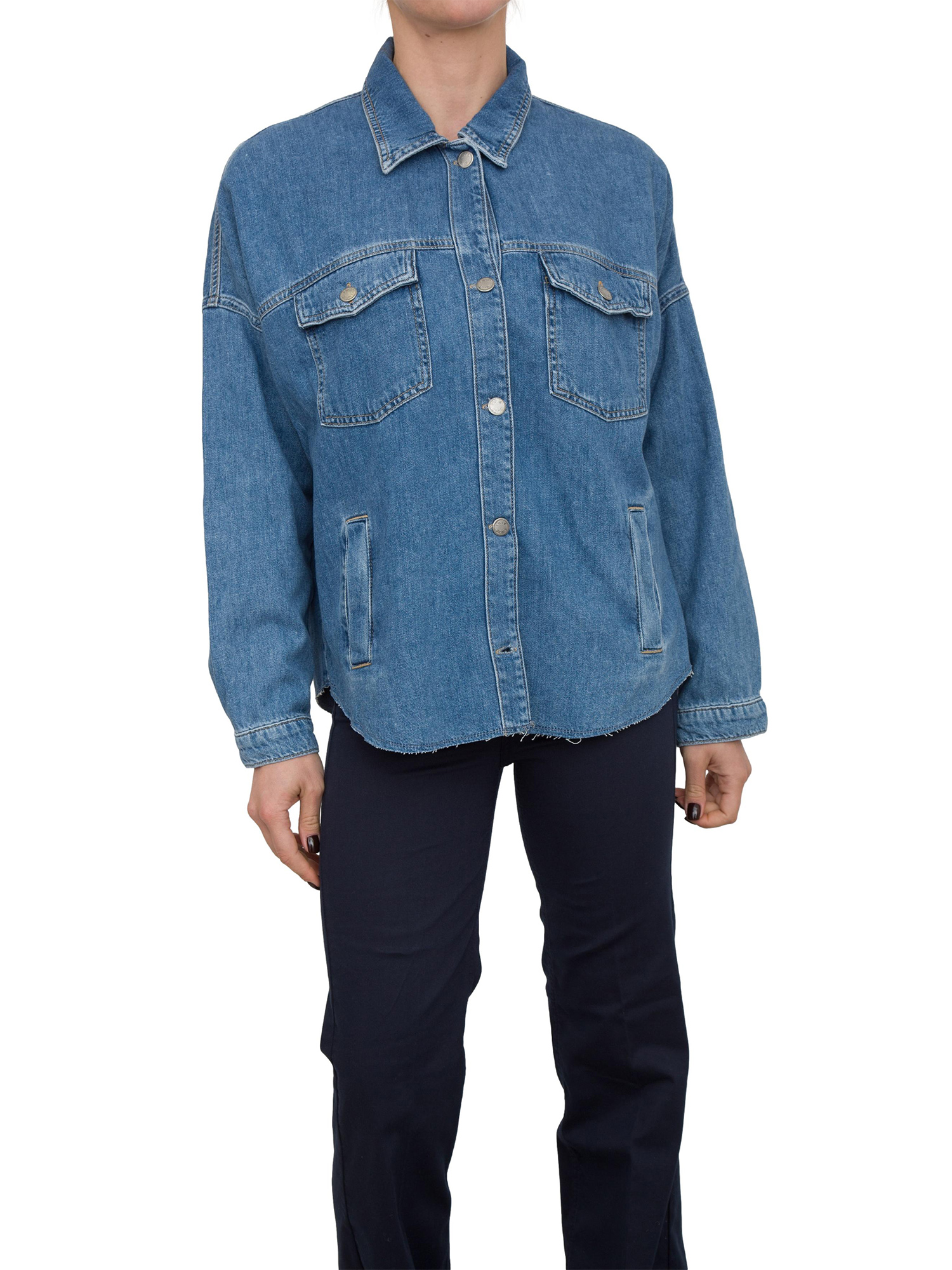 Brand: LIU JOGiubbino modello over in denim, chiusura frontale con bottoni logati a vista, colletto a camicia, manica lunga con spalla scesa e chiusa con polso e bottone logato a vista, due in piedi e due tasche a toppa frontali chiuse con pattina e bottone logato a vista.La modella è alta 1.72 e indossa la taglia S.