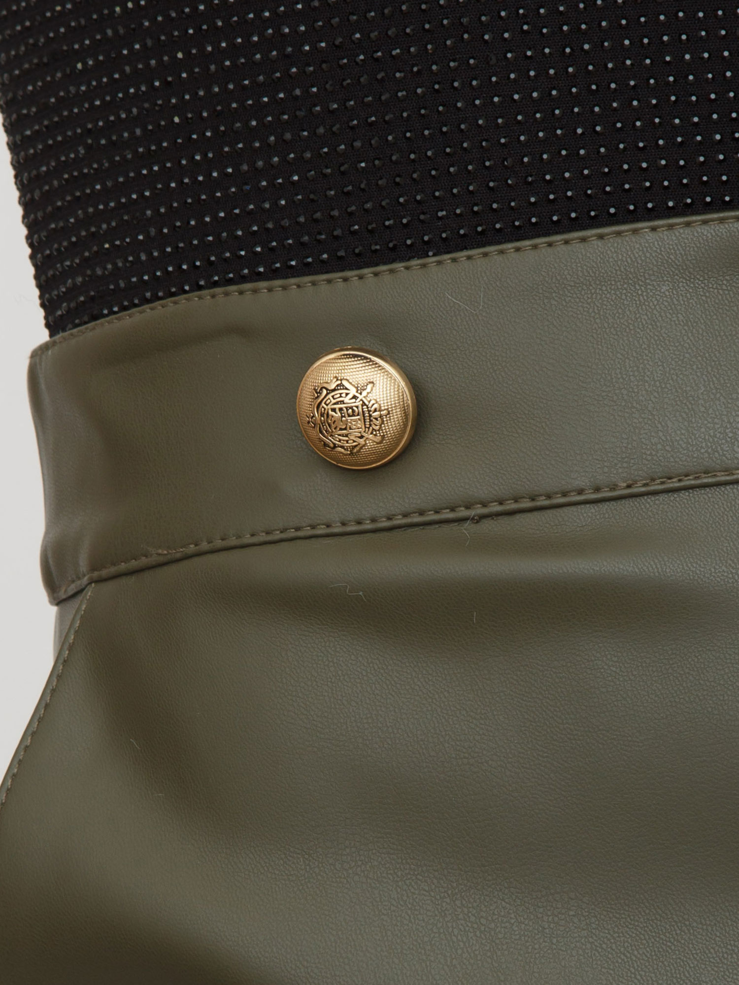 Brand: KOCCALo stile minimal di questa gonna corta Mariaelisa firmata Kocca è impreziosito dal tessuto in ecopelle e da due bottoni dorati in vita che regalano stile e carattere al capo. La modella è alta 1.72 e indossa la taglia 38.