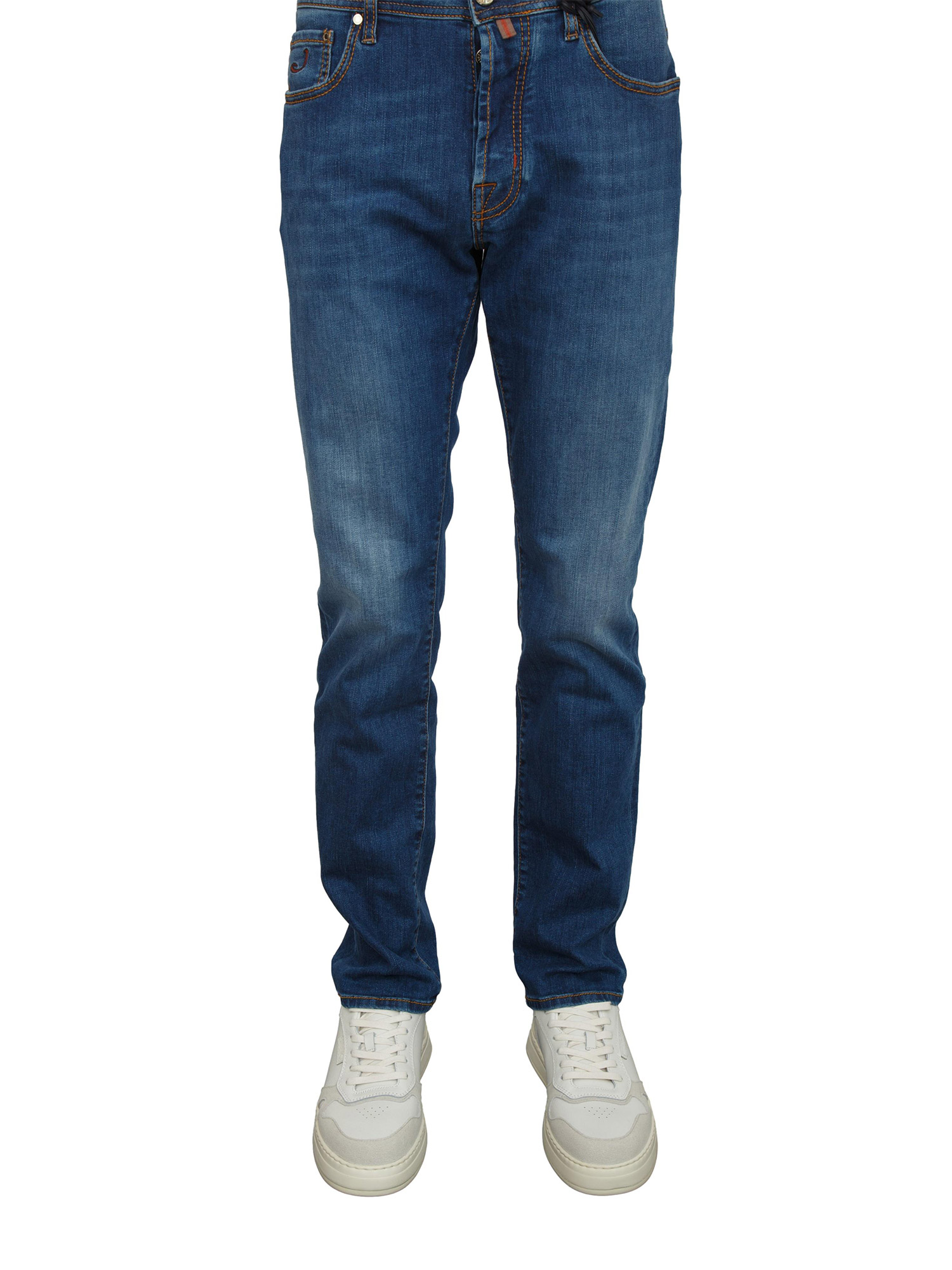 Brand: JACOB COHENJeans uomo Jacob Cohen modello Bard cinque tasche slim fit a vita media. Denim comfort indaco di cotone blu scuro vintage, stone bleach e texture morbida. Salpa color mattone con logo tono su tono e bandana inclusa. Il modello è alto 1.90m e indossa la taglia 32.