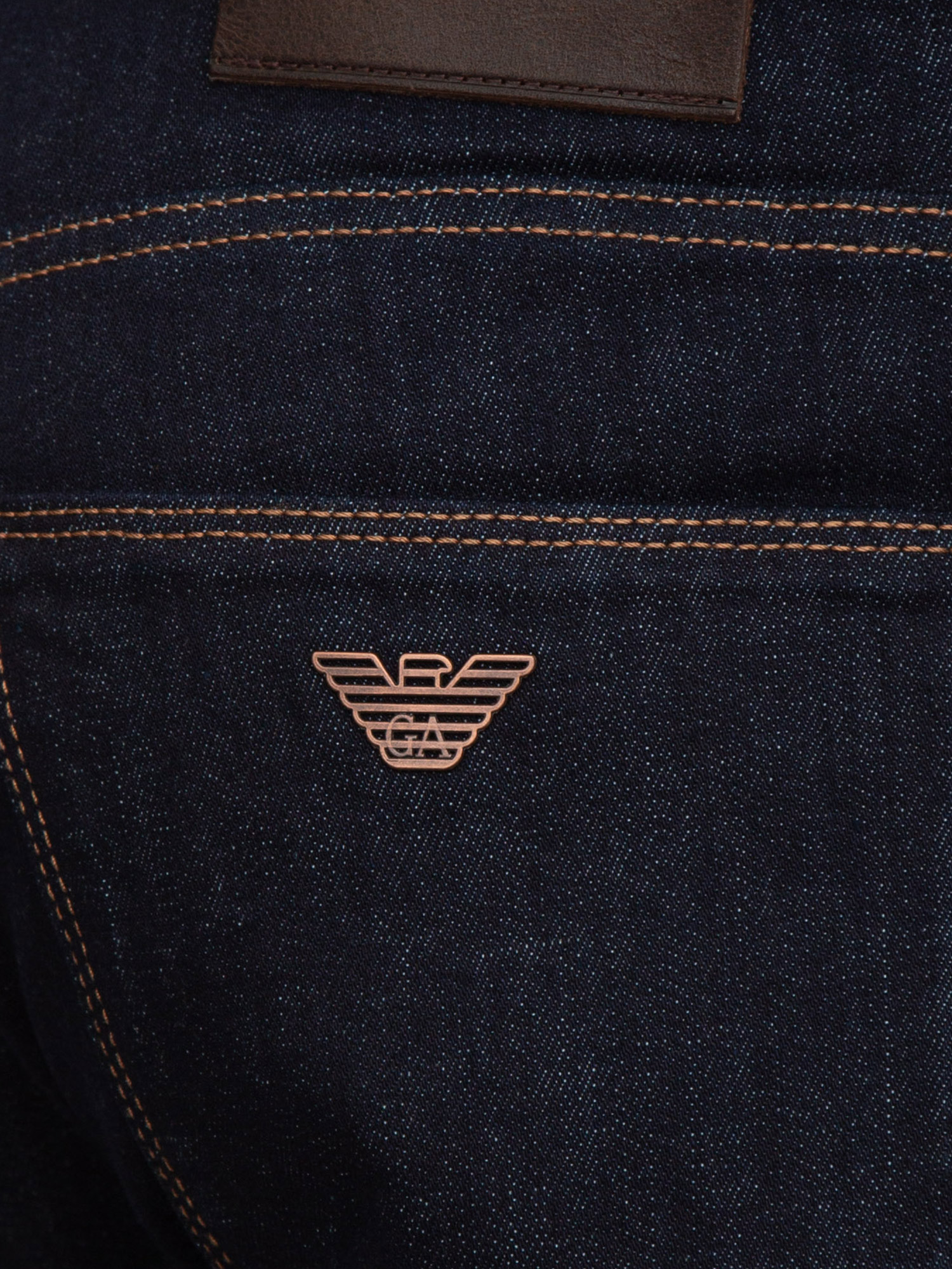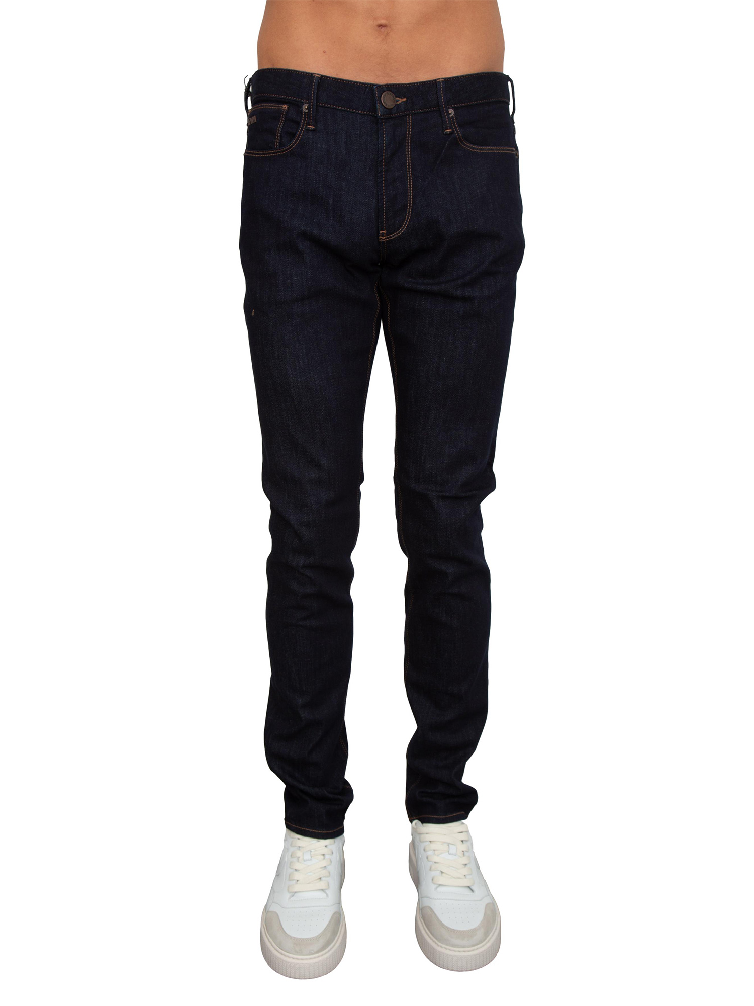 Brand: EMPORIO ARMANIJeans uomo Emporio Armani realizzati in comodo cotone elasticizzato blu scuro. Design con vita bassa e vestibilità slim fit, dotato di tasche con cuciture a contrasto e logo in metallo sul retro. Il modello è alto 1.90m e indossa la taglia 32.
