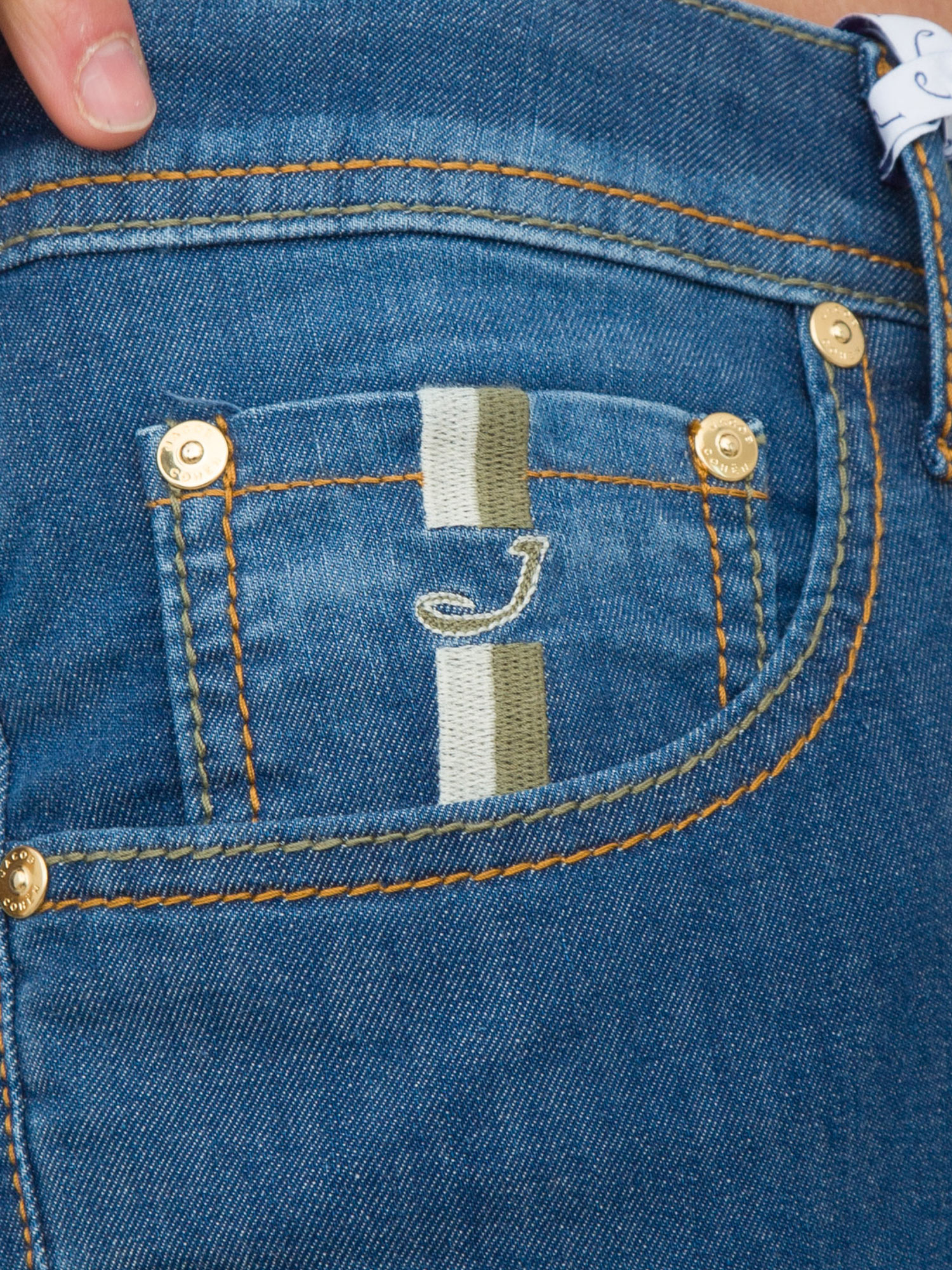 Brand: JACOB COHENJeans uomo 5 tasche Jacob Cohen modello Eduard vestibilità regular-slim fit a vita media realizzati in denim di cotone comfort blu con lavaggio bleach, baffature, sabbiatura a mano, spazzolatura totalmente a mano e texture morbida. Salpa in pelle marrone, bianca e verde e bottone oro lavorato. Il modello è alto 1.90m e indossa la taglia 32.
