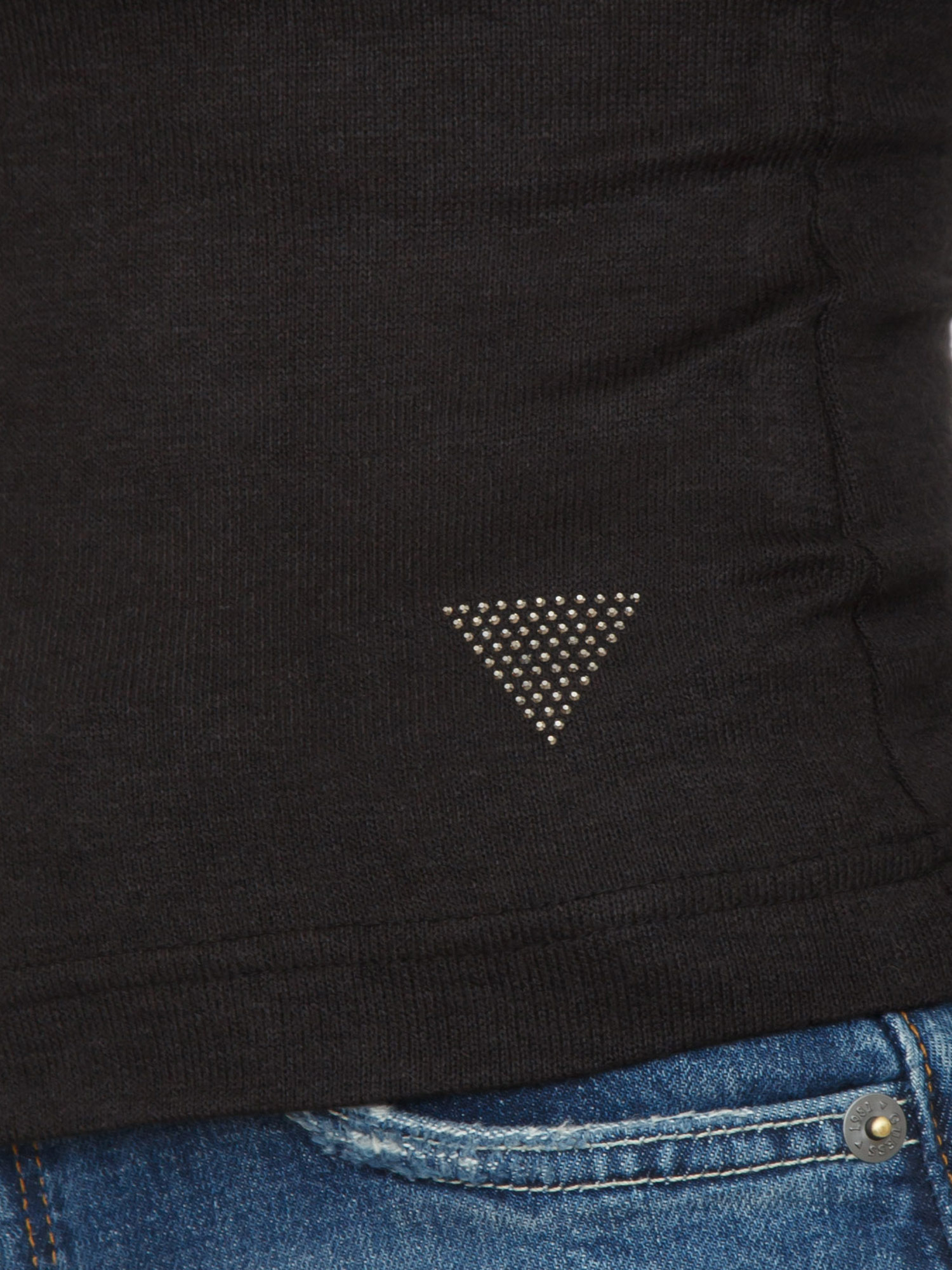 Brand: GUESS JEANSMaglia lupetto Guess Jeans donna realizzata in jersey di misto viscosa con vestibilità aderente e logo tiangolo con strass. La modella è alta 1.72 e indossa la taglia XS.